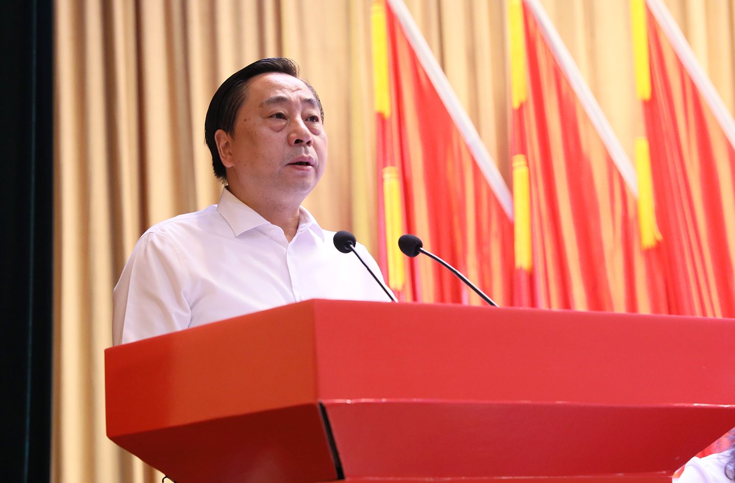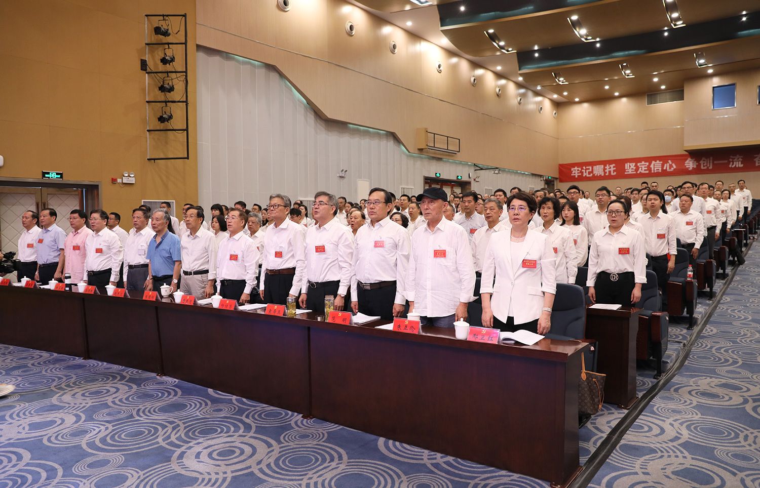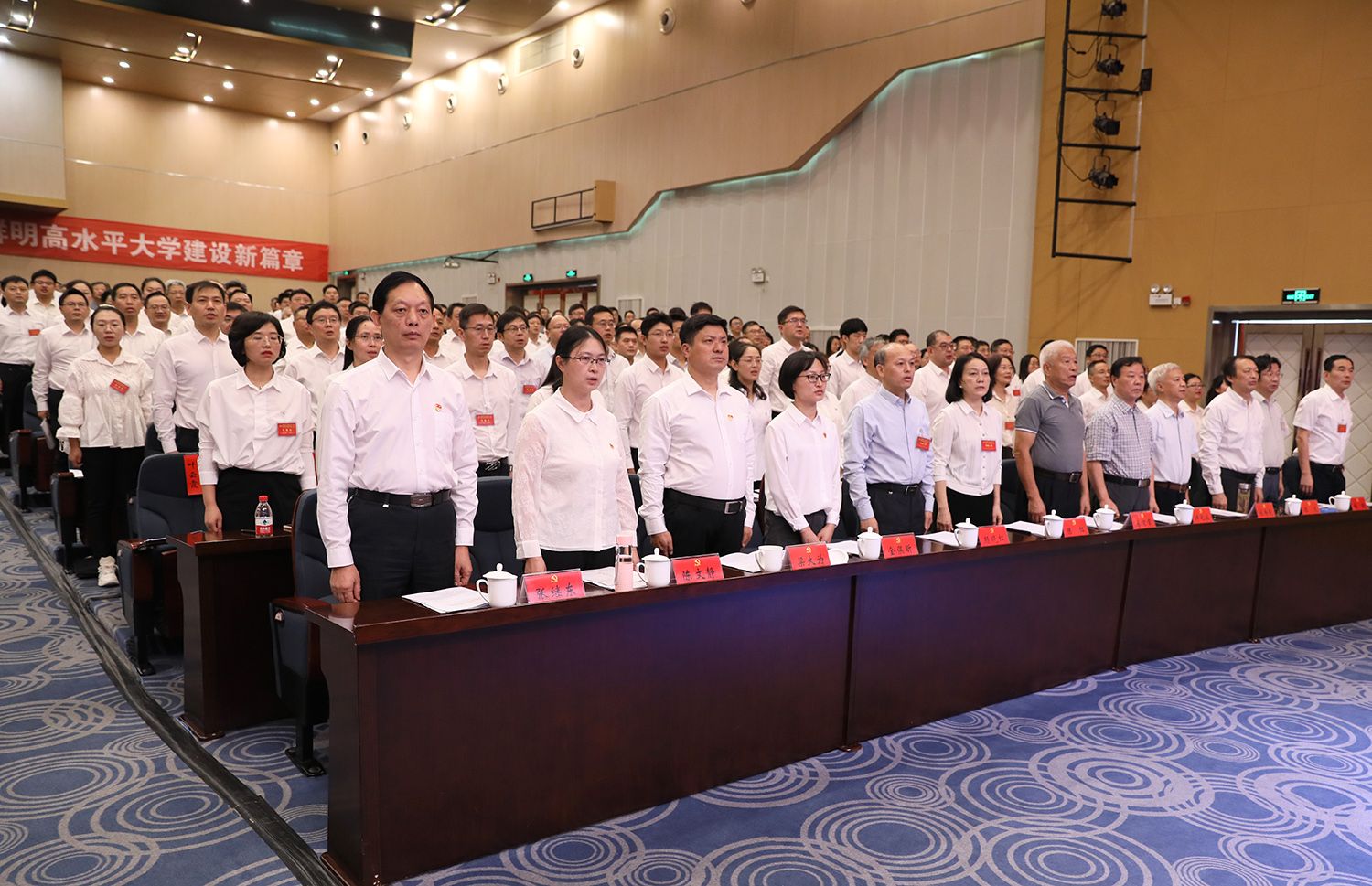 开幕会现场气氛庄严热烈,主席台正中悬挂的中国共产党党徽熠熠生辉,10面鲜艳的红旗分列两侧。会场后方,“牢记嘱托,坚定信心,争创一流,奋力谱写特色鲜明高水平大学建设新篇章”的横幅庄重醒目。