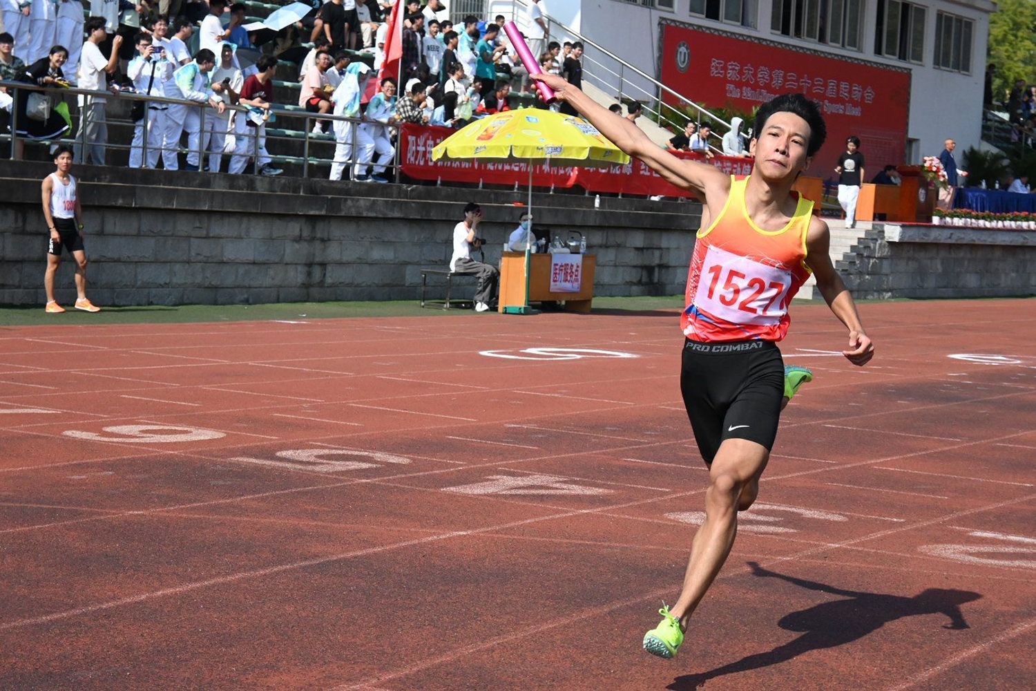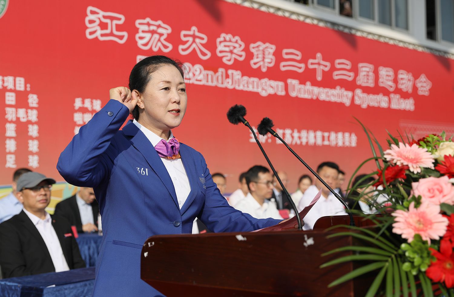 国家冰球队原队长、速度轮滑国际级裁判、轮滑球国际级裁判,执裁杭州第19届亚运会的体育部教师胡玉芹代表裁判员宣誓。第21届全国大学生田径锦标赛100米、200米冠军杨阳代表运动员宣誓。