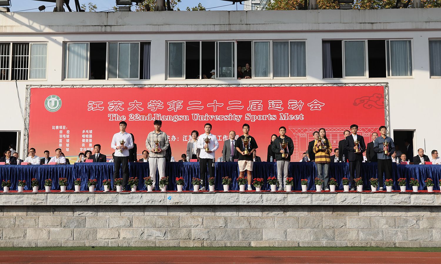 校党委常委、副校长任旭东宣读第二十一届运动会大学生团体总分前八名的单位和2022-2023年度教工群众体育工作先进单位表彰名单。主席台领导为获表彰单位颁奖。