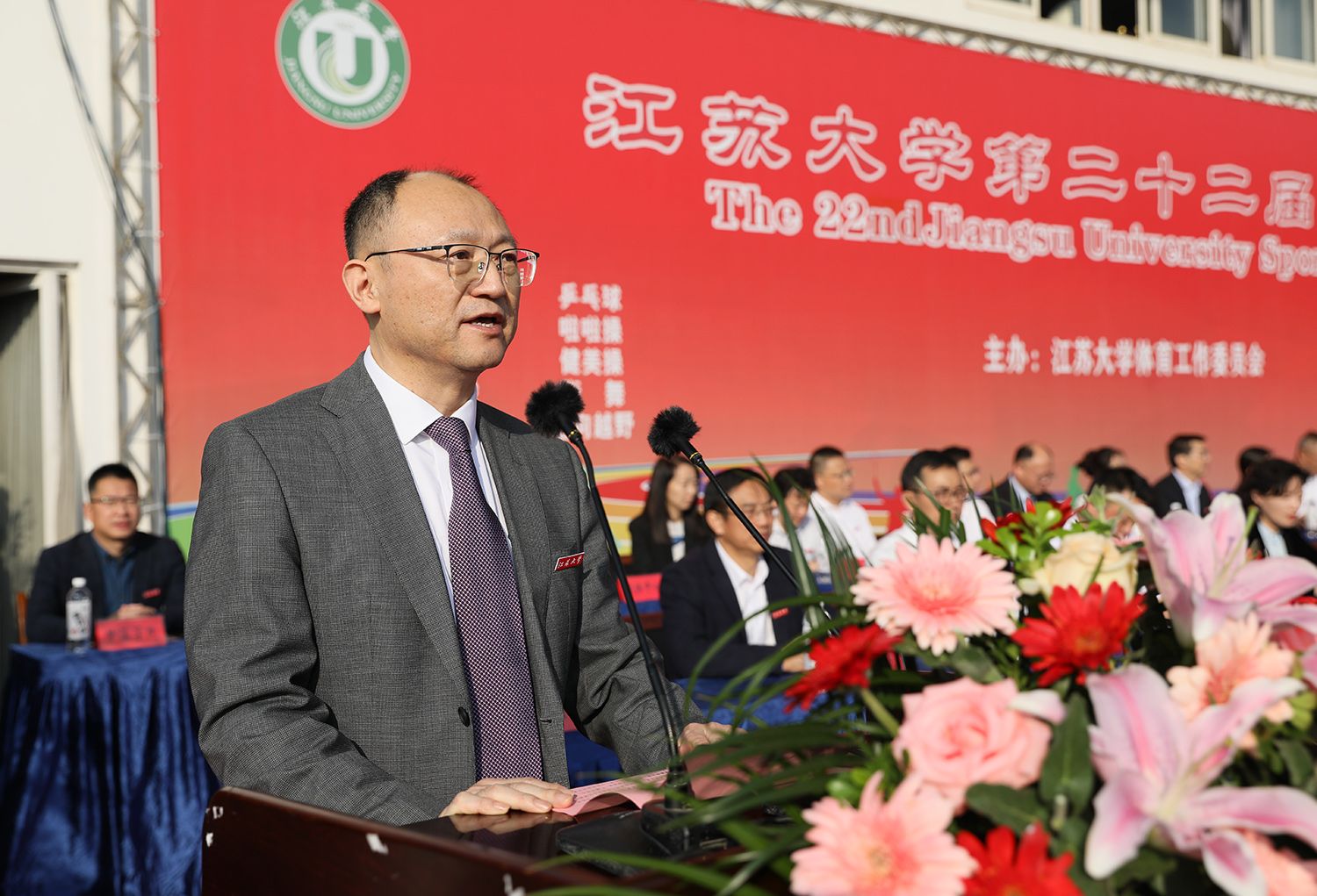 校党委副书记张济建致开幕辞。他指出,一年来,在全校师生的积极参与和共同努力下,学校体育工作取得丰硕成果,学校成功入选首批全国健康学校。在体育教学方面,完善了体育课程体系,实施课外阳光长跑活动,学生体质健康测试达标率、优良率逐年提高;在群众体育方面,举办第二十一届运动会田径比赛,精心组织 “江大杯”大学生男女篮球、“校长杯”足球、排球、羽毛球、乒乓球、定向越野、游泳、排舞等赛事,极大地丰富了师生的校园体育文化生活,广大师生积极参与体育运动的校园氛围日益浓厚;在竞技体育方面,学校运动员敢于拼搏、勇争一流,在国际、同内重量级比赛中取得丰硕成果。他希望师生在今后的学习工作中,大力发扬体育运动蕴含的争先意识、拼搏精神和坚强意志,助力学校“双一流”创建和特色鲜明高水平大学建设。