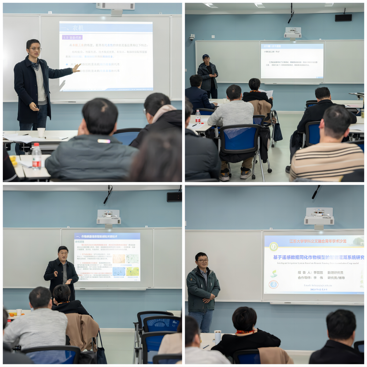 马征作《江大的农机与农机的“江”来》主旨报告,报告基于农机行业特色和开云手机·官方站官网农机发展历程,提出了未来农机应面向应用基础和高技术突破的校内多学科交叉融合发展建议。计算机科学与通信工程学院李峰、电气信息工程学院杨宁、流体机械工程技术研究中心季磊磊三位老师作《智能物联与群智协同》《作物病害信息智能感知与专用传感器关键技术研究》《基于遥感数据同化作物模型的智能灌溉系统研究》报告,现场专家、青年学者、博士生就报告中的相关问题从不同学科视角展开了交流与探讨。