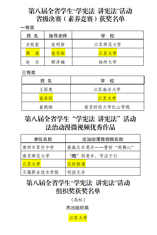 近日,省教育厅办公室下发了《省教育厅关于公布第八届全省学生“学宪法 讲宪法”活动结果的通知》,我校法学院学生周涛(指导教师张冬阳)获得素养竞赛一等奖,张泽同获得三等奖;我校推荐的动漫微视频《反奸防谍》获评法治动漫微视频优秀作品;学校获评杰出组织奖。