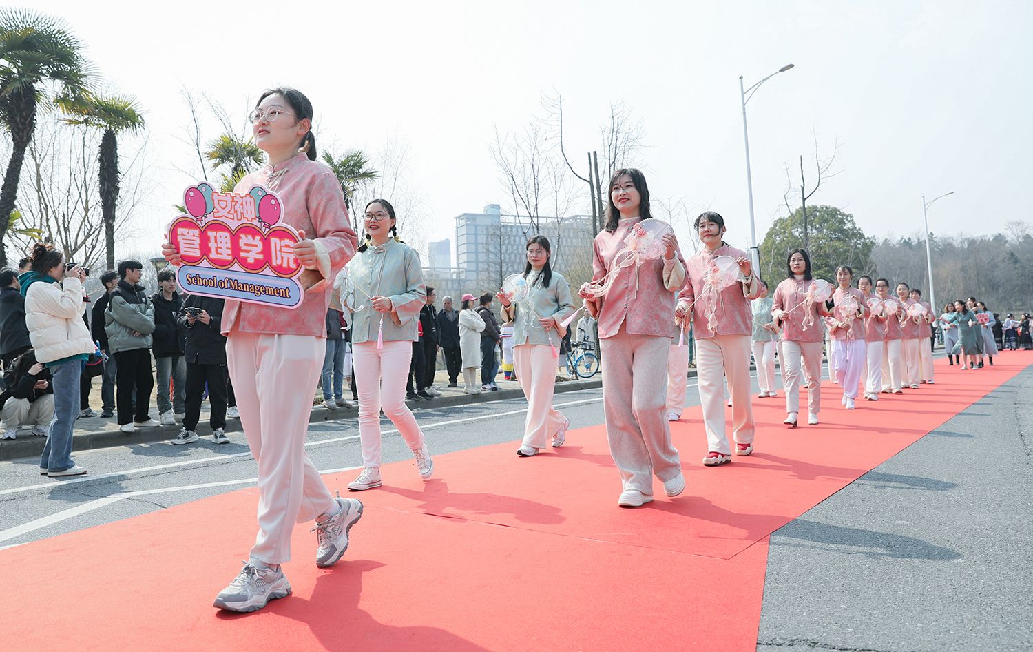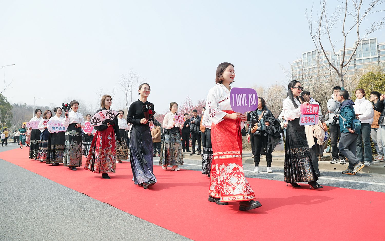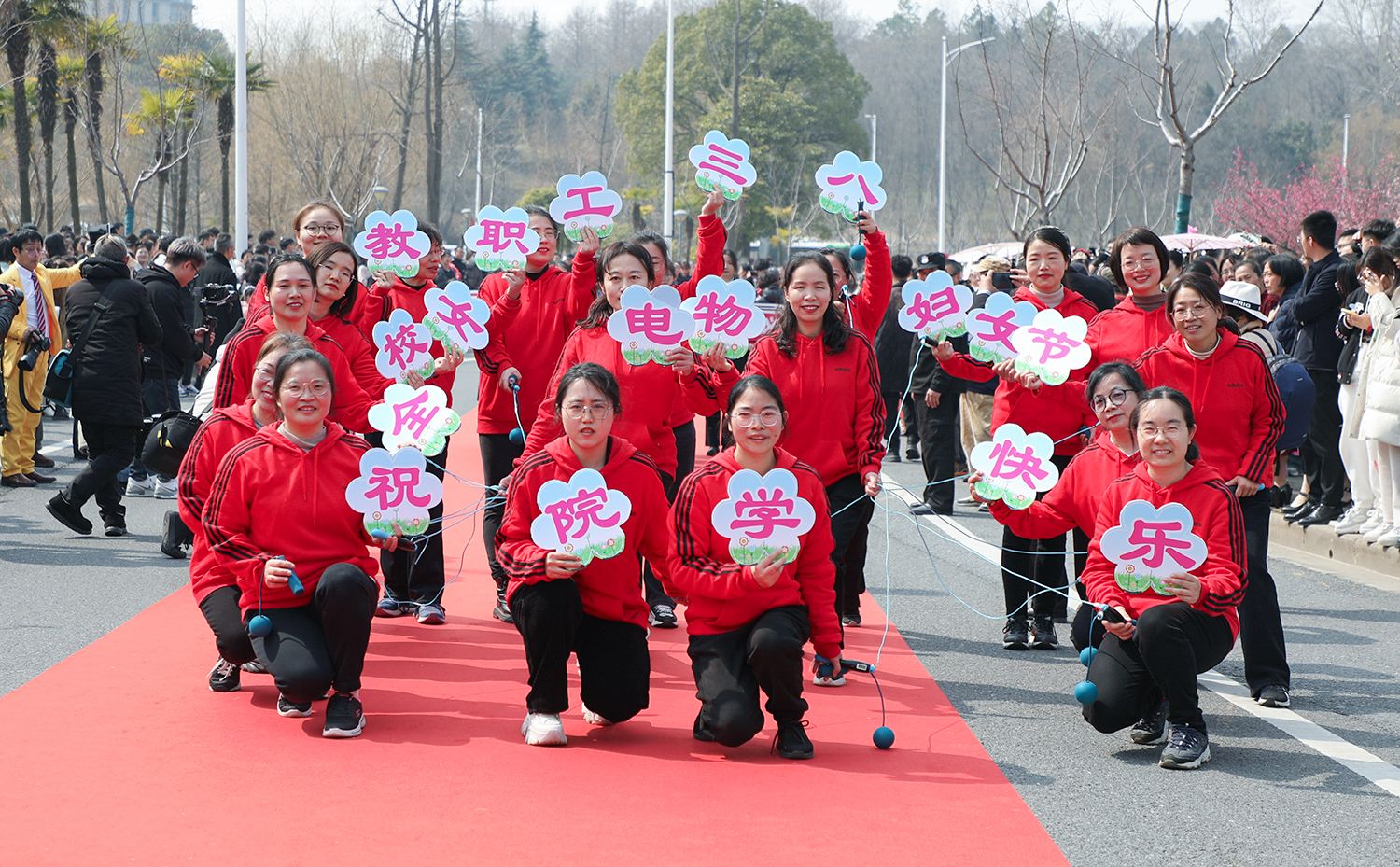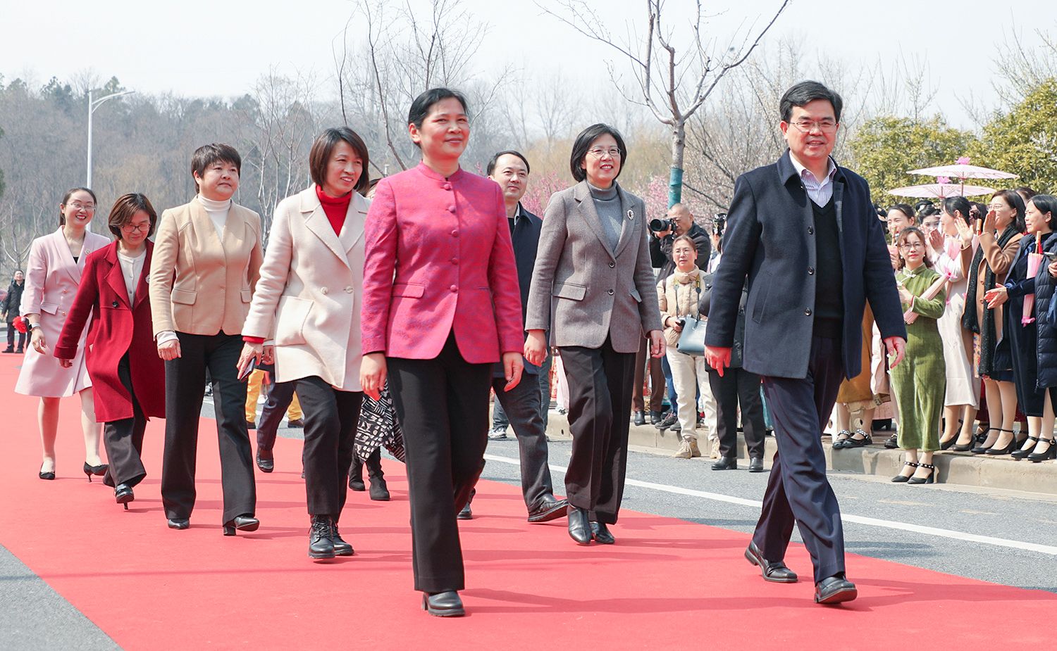 早春江大,处处是生机勃勃的景象。3月8日,是第114个国际劳动妇女节,学校在梅园举办“美丽邂逅,梦想绽放”庆祝“三八”国际妇女节活动暨首届梅樱节开幕式。由女教工、女大学生、女企业家组成的33支队伍共聚梅园,借满园春色,用“红毯秀”的形式展示女性风采,庆祝自己的节日。