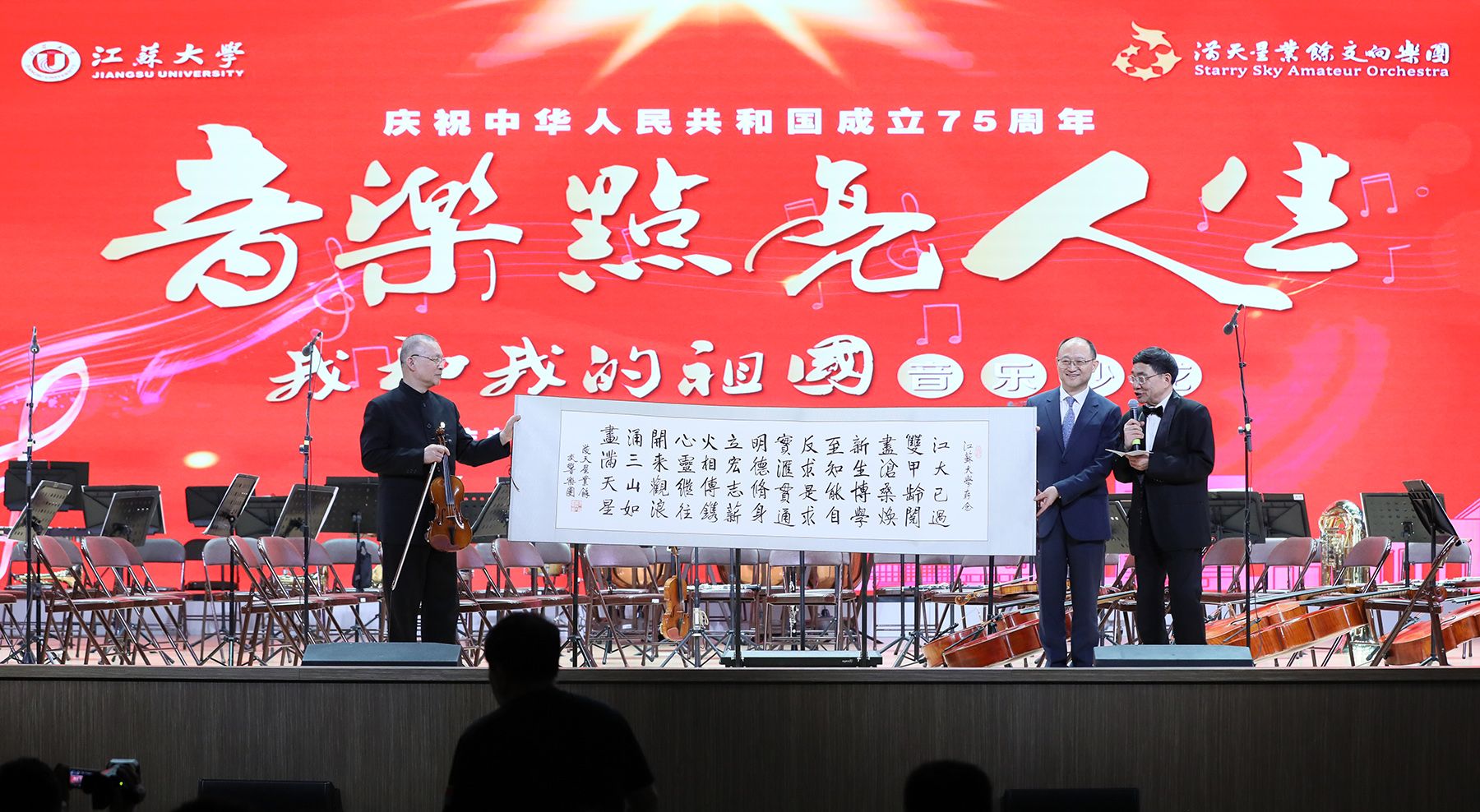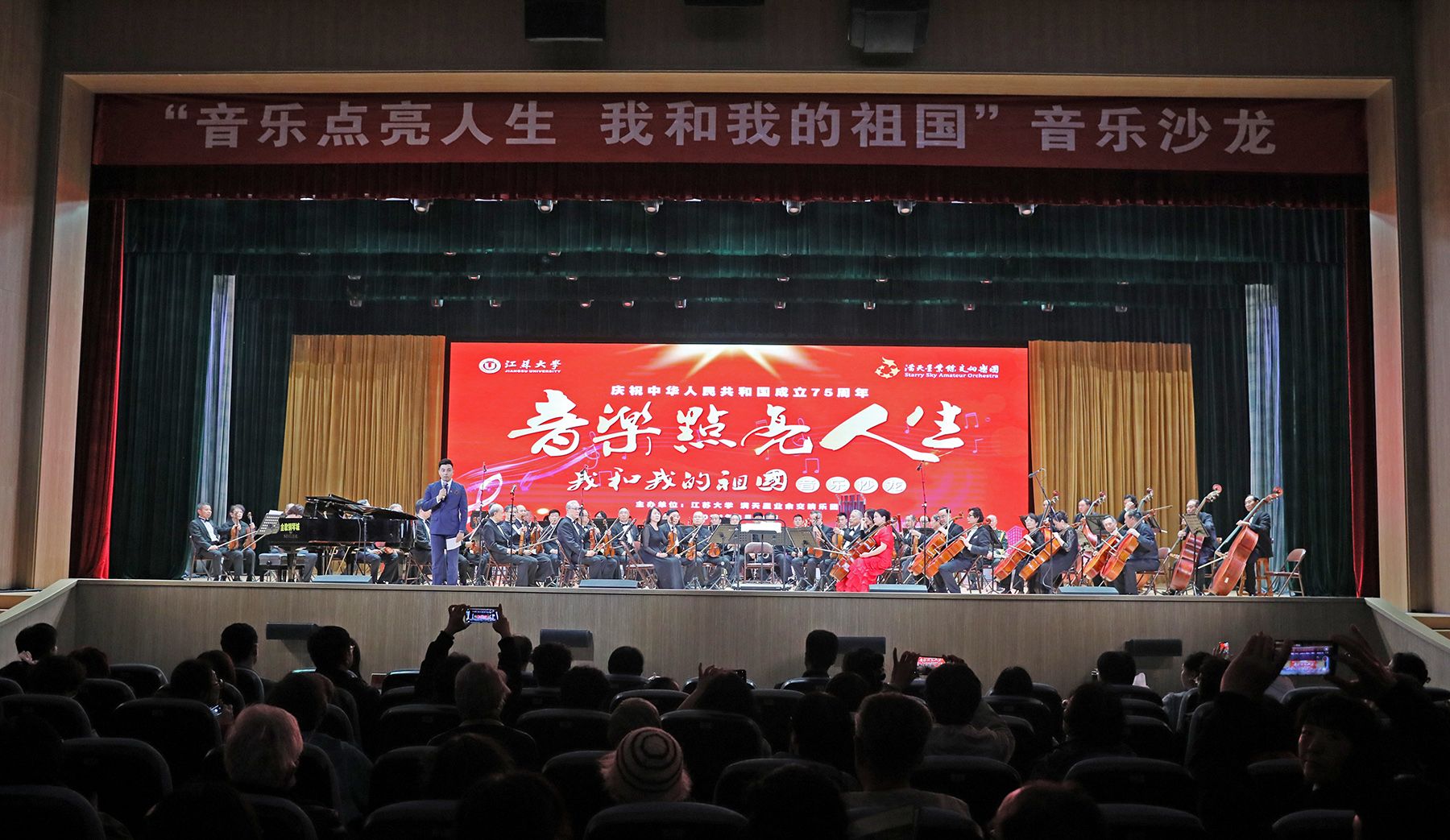 3月30日晚,满天星业余交响乐团应邀走进我校,在学校大礼堂举办“音乐点亮人生 我和我的祖国”专场音乐沙龙,为全校师生带来了一场高雅艺术视听盛宴。校党委书记李洪波、镇江市副市长武鸣会见了乐团主要成员。校长邢卫红,校党委副书记张济建,校党委常委、宣传部部长、统战部部长吴麟麟,以及现场师生1400 余人共同聆听经典名曲,感受高雅艺术魅力。