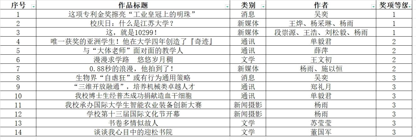 日前,由江苏省高校融媒体研究会(原江苏省高校校报研究会)主办的2023年度江苏省高校校报优秀作品评选结果揭晓。我校报送的14篇作品获奖,其中一等奖3篇、二等奖4篇、三等奖7篇,获奖类别涵盖消息、通讯、文学、新闻摄影和新媒体等类别,获奖数量、等级居全省高校前列。