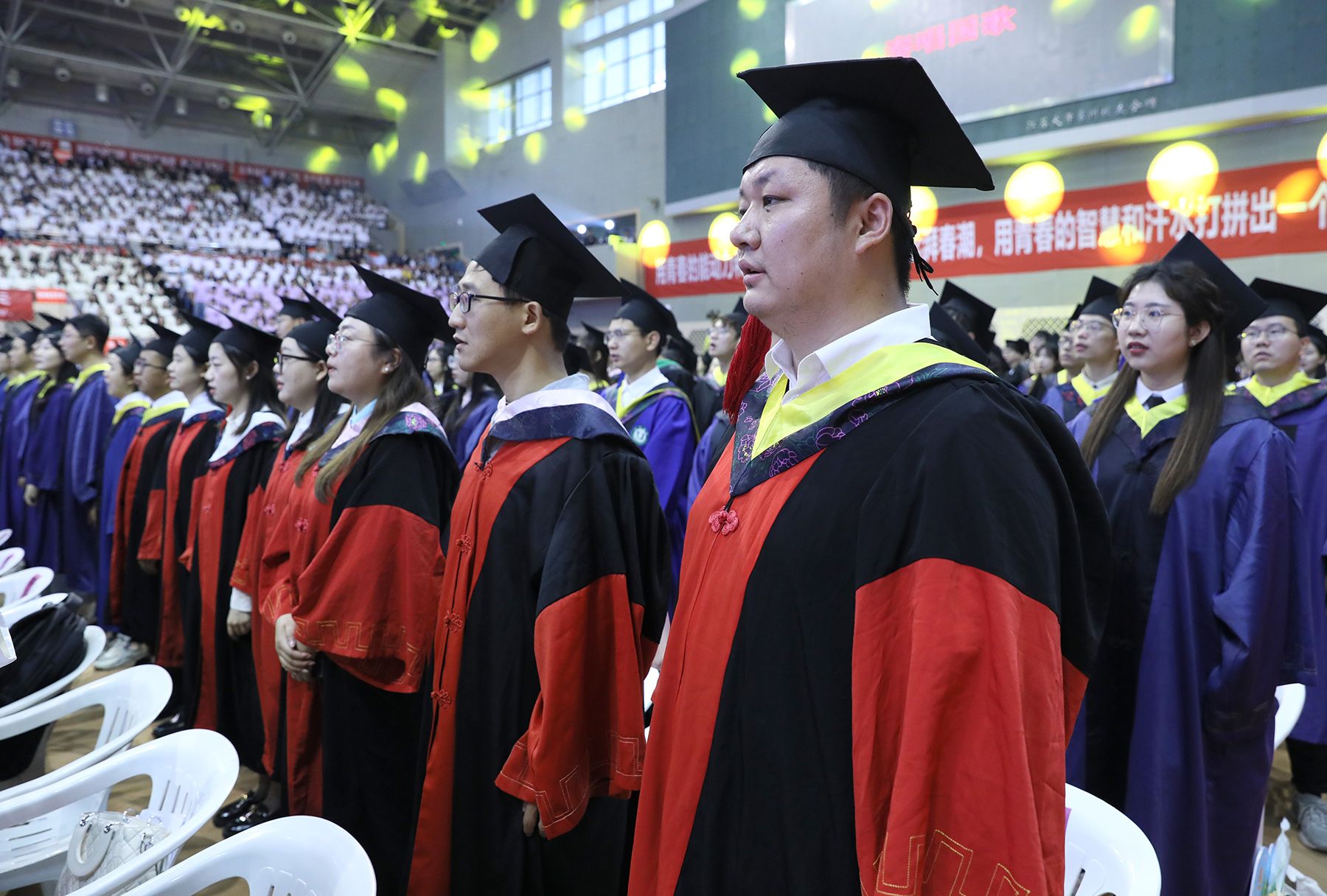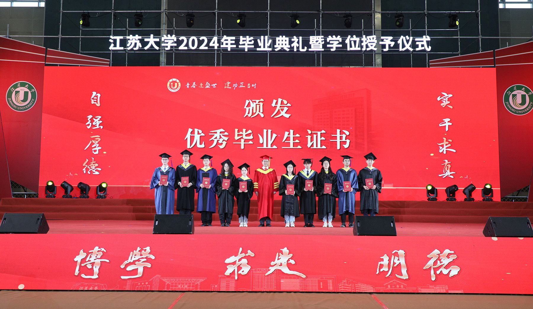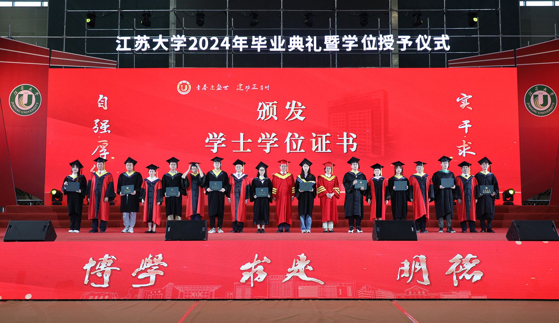 学位授予仪式上,校领导、校党委常委为博士、硕士、学士学位代表颁发学位证书并扶正流苏。