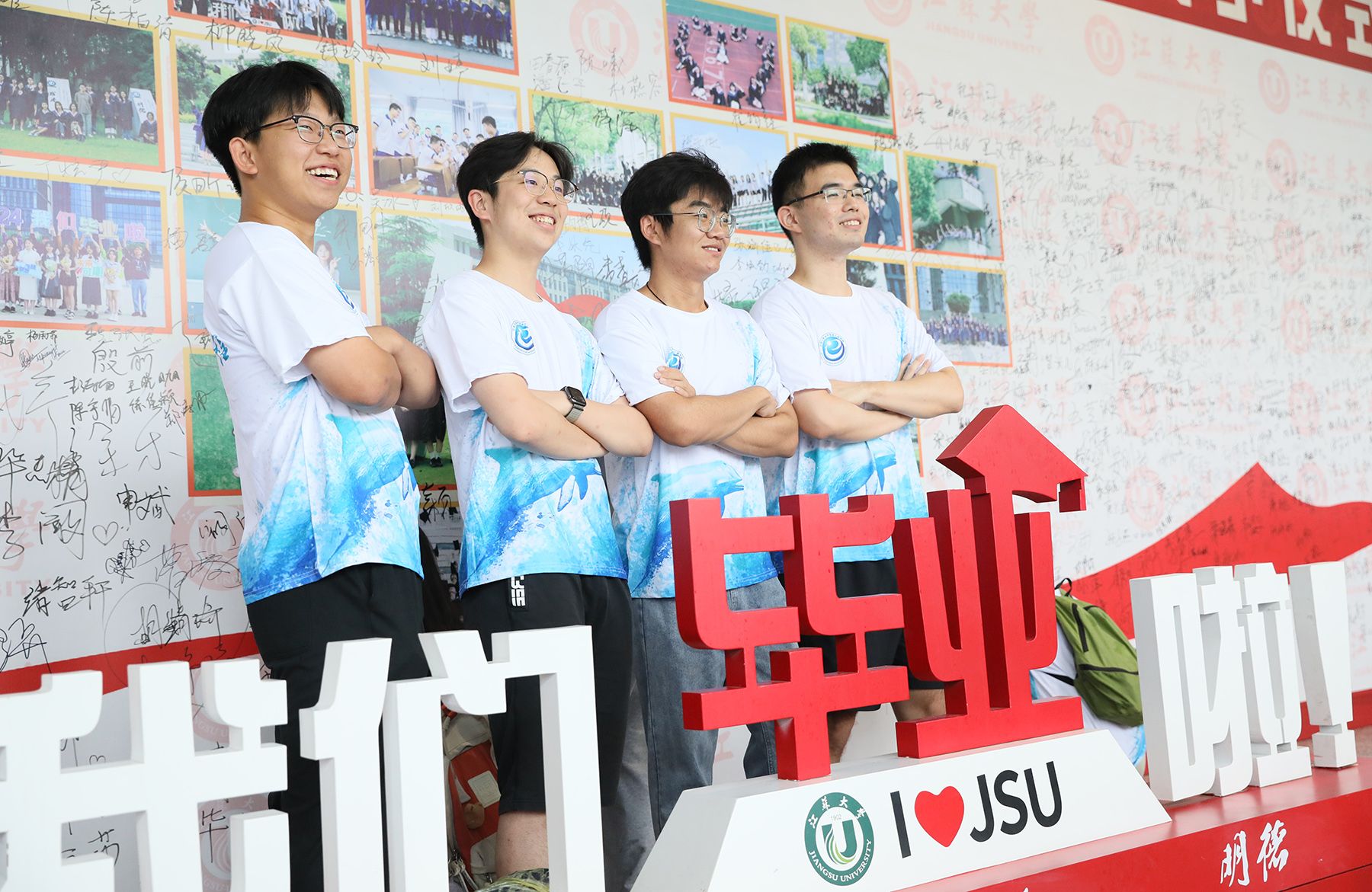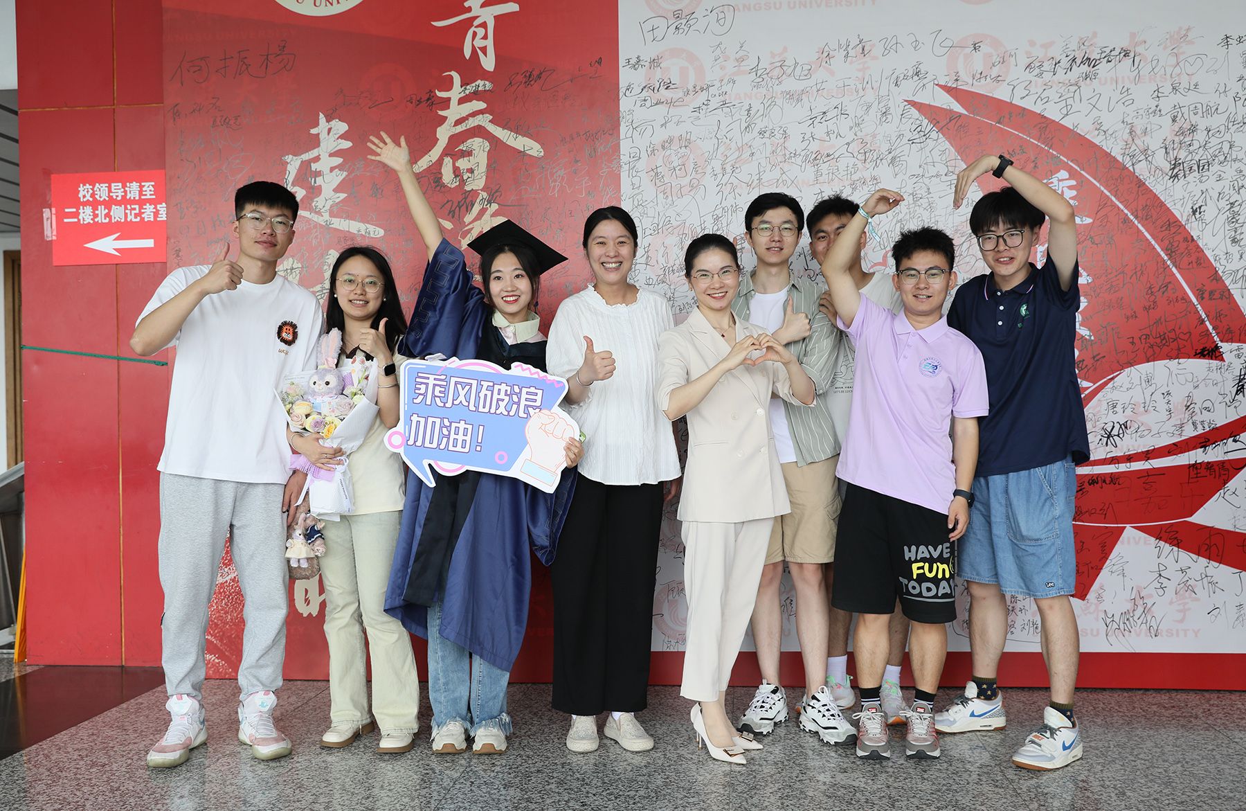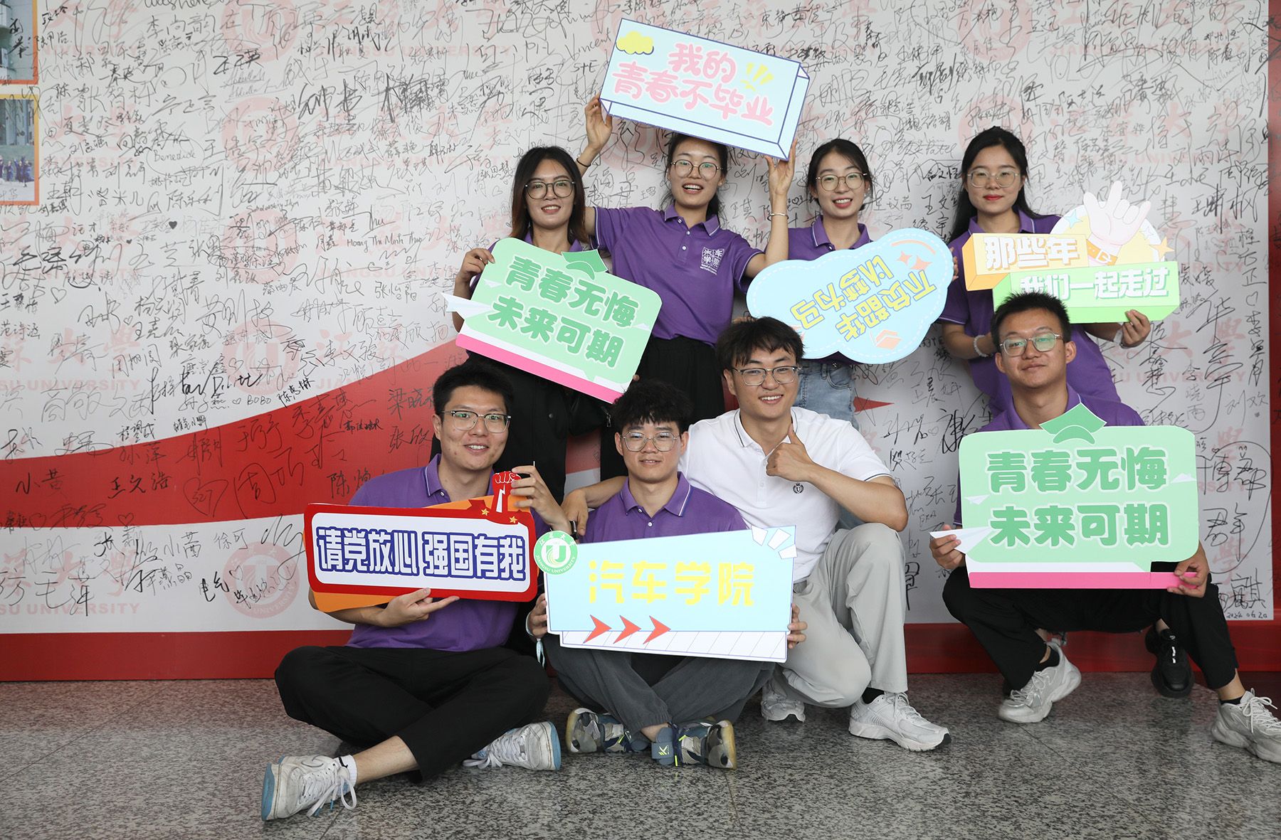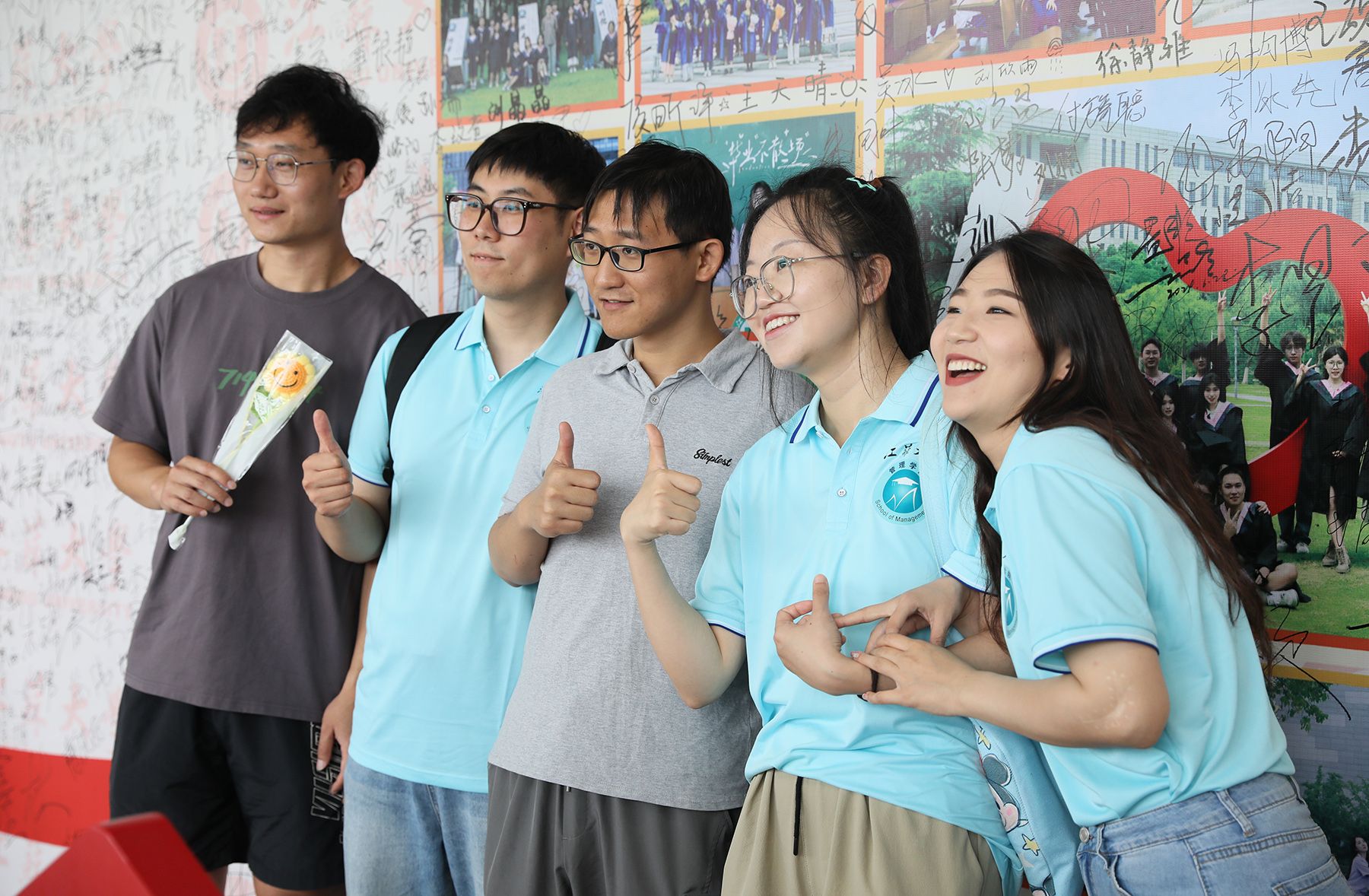 典礼现场外,毕业生们在签名墙上签名,并拍照留念,留下对大学生活的美好回忆。