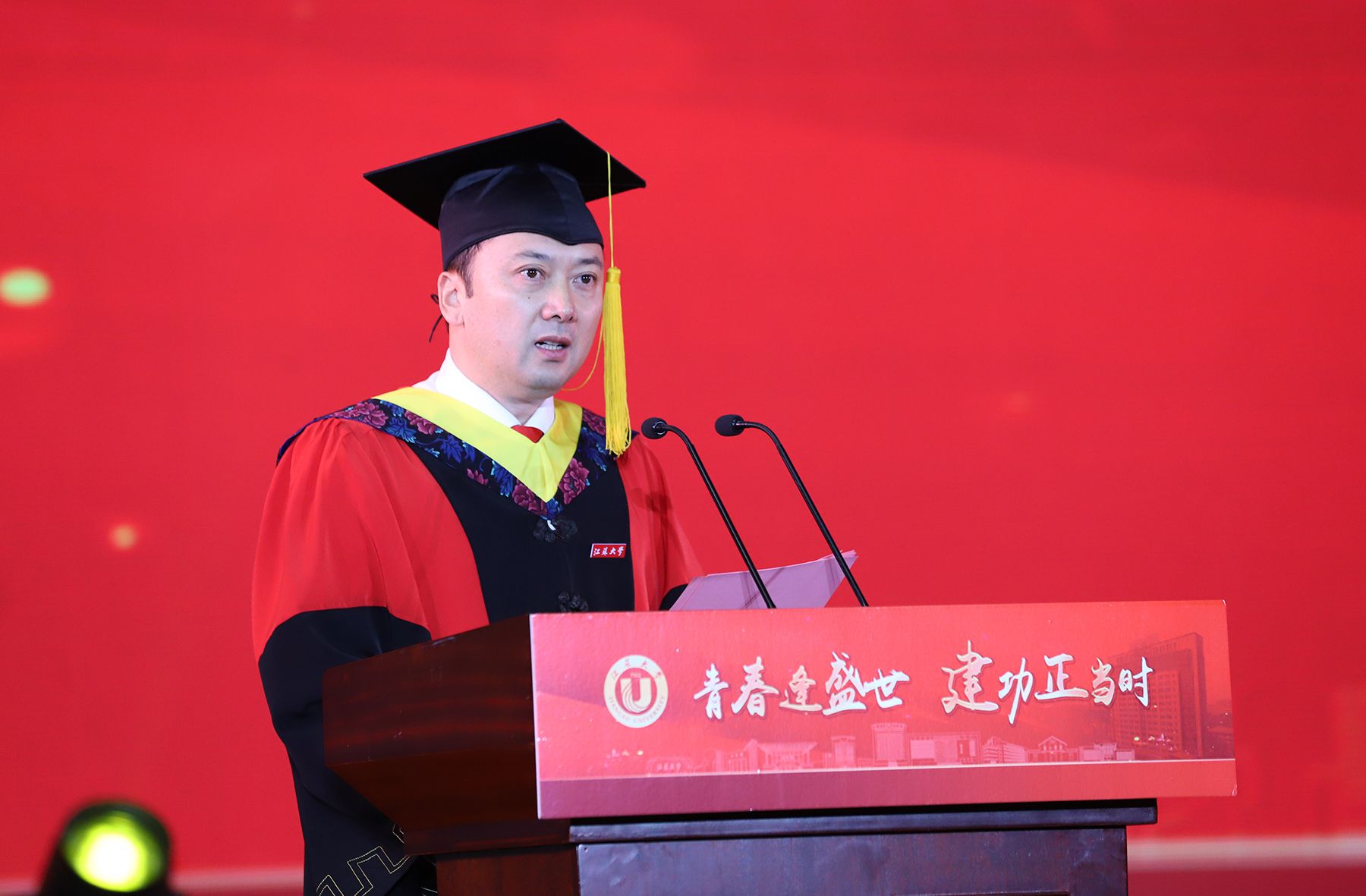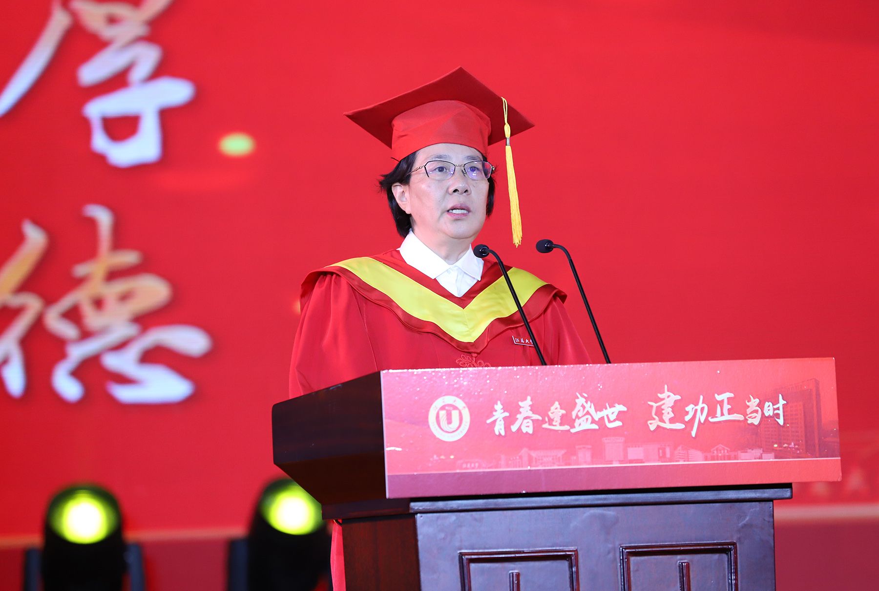校长邢卫红发表题为《青春不设限 未来更无限》的讲话。她代表学校向即将踏上新征程的全体毕业生致以最热烈的祝贺。邢卫红在讲话中深情寄语,充分肯定毕业生们在校取得的优异成绩,鼓励同学们继续与伟大时代同向同行,在更广阔的天地绽放更大的荣光。邢卫红说,在江大,2024届毕业生们刻下了青春的记忆和模样、积攒了前行的底气和力量,走出了不平凡的足迹,递交了优秀的成绩单。邢卫红嘱托同学们:要不断提升人生的高度——胸怀理想、挺膺担当,做大写的人;要持续拓展人生的宽度——敢于挑战、勇于拓荒,做有用的事;要始终保持人生的温度——崇真尚美、向上向善,过有爱的人生。邢卫红殷切希望每一位毕业生同学能够健康快乐、前程无限好,用自己喜欢的方式过好这一生,并祝愿大家能够不负时代、不负韶华,去开拓人生道路上的无限可能,在新征程上谱写江大人的荣耀与辉煌。