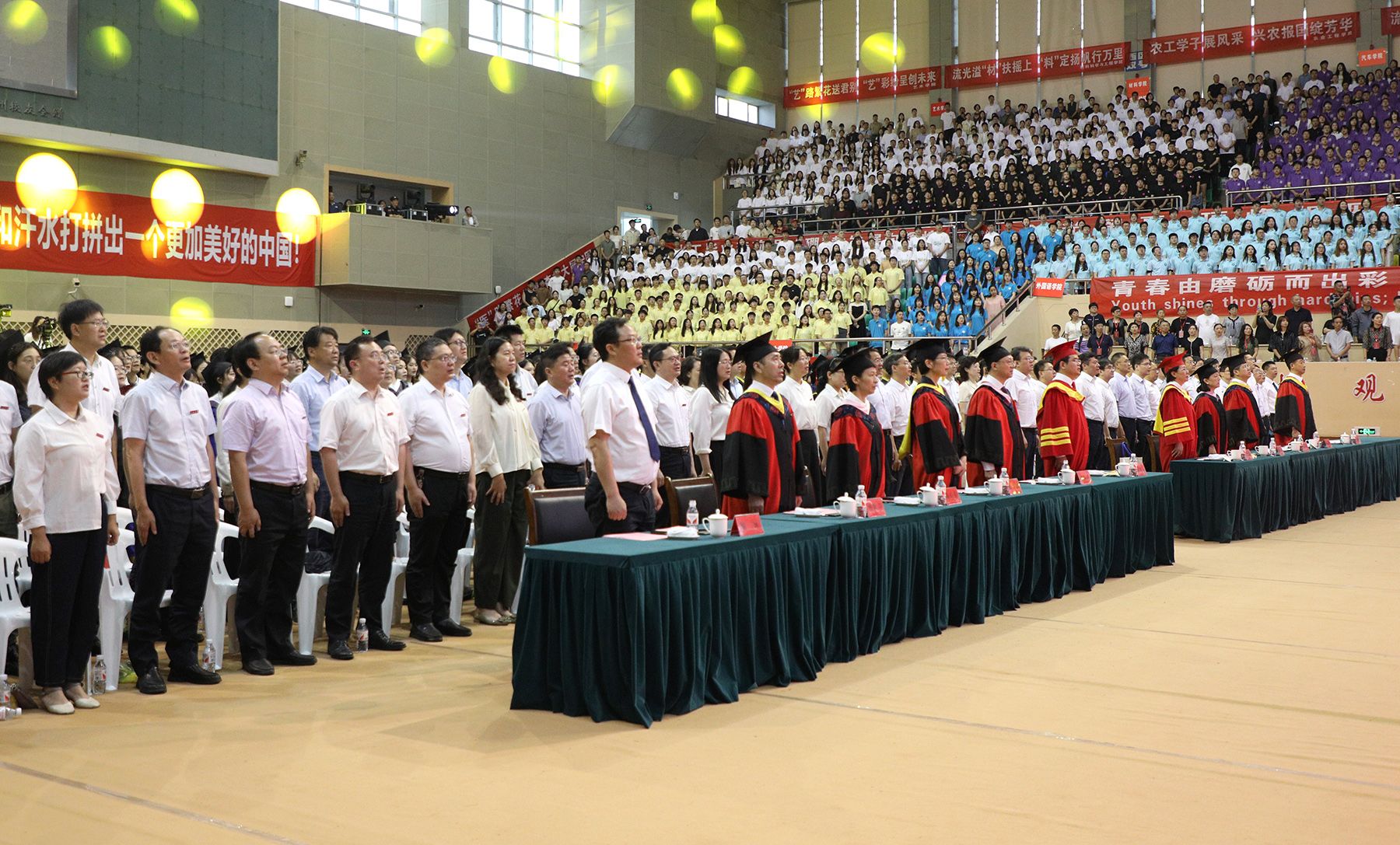 典礼上,全体起立,奏唱国歌。