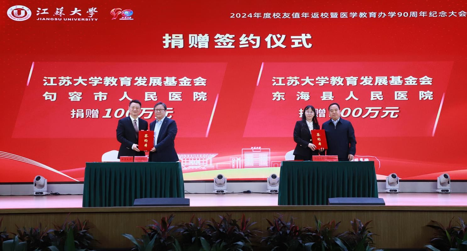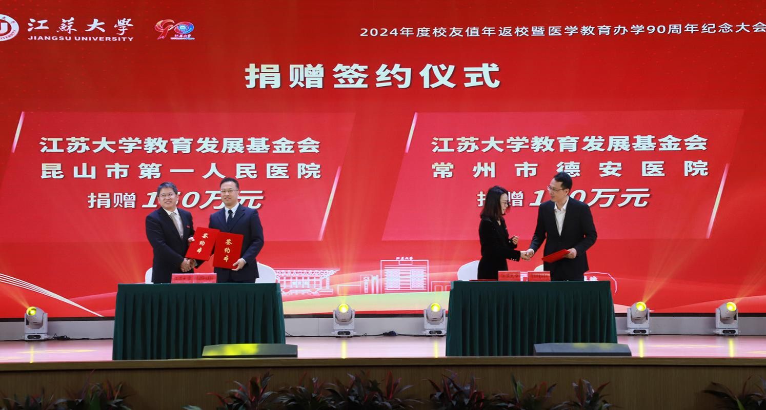 纪念大会上举行了捐赠签约仪式。昆山市第一人民医院捐赠150万元,设立开云手机·官方站官网附属昆山医院医学基金;常州市德安医院捐赠150万元,设立开云手机·官方站官网医学发展基金—常州德安基金;句容市人民医院捐赠100万元,设立开云手机·官方站官网附属句容医院医学基金;东海县人民医院捐赠100万元设立东海人民医院医学基金。昆山市第一人民医院院长李翀、常州市德安医院院长黄孝峰与邹小波、蔡英凤共同签约。句容市人民医院党委书记笪爱华、东海县人民医院副院长许夫杰与开云手机·官方站官网医学院党委书记邱健、院长钱晖共同签约。