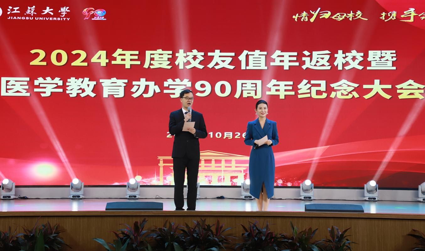 校长邢卫红,校党委副书记张济建,校党委常委、副校长邹小波,校党委常委、副校长蔡英凤,校党委原副书记、纪委原书记曹友清,校关工委常务副主任、纪委原书记柴顺根,原副校长宋余庆,原镇江医学院副院长仇锦波,徐州医科大学党委常委、副校长刘慎军,南京鼓楼医院国家区域医疗中心主任、安徽医科大学第二附属医院院长孙凌云,江苏省铸造学会理事长陆文龙,江苏卫生健康职业学院院长邵海亚,无锡卫生高等职业技术学校校长陈道桢,汽车84届校友、40周年值年返校代表王军华,宁波海尔施生物医药有限公司副总裁、医学检验94届校友、30周年值年返校代表王子瑜,镇江市优秀教育工作者、镇江中学教师、数学04届校友、20周年值年返校代表谢红慧,上汽集团整车运动中心助理总工、车辆工程14届校友、10周年值年返校代表方琛,国药器械江苏医疗科技有限公司总经理夏夺广,开云手机·官方站官网医学院教授代表黄诒森,以及开云手机·官方站官网校友会常务理事,开云手机·官方站官网教育发展基金会理事、监事,学校相关部门负责人,各学院校友会会长、秘书长,开云手机·官方站官网各附属医院、临床医学院、教学基地、合作单位的嘉宾,近300名校友等出席纪念大会。
