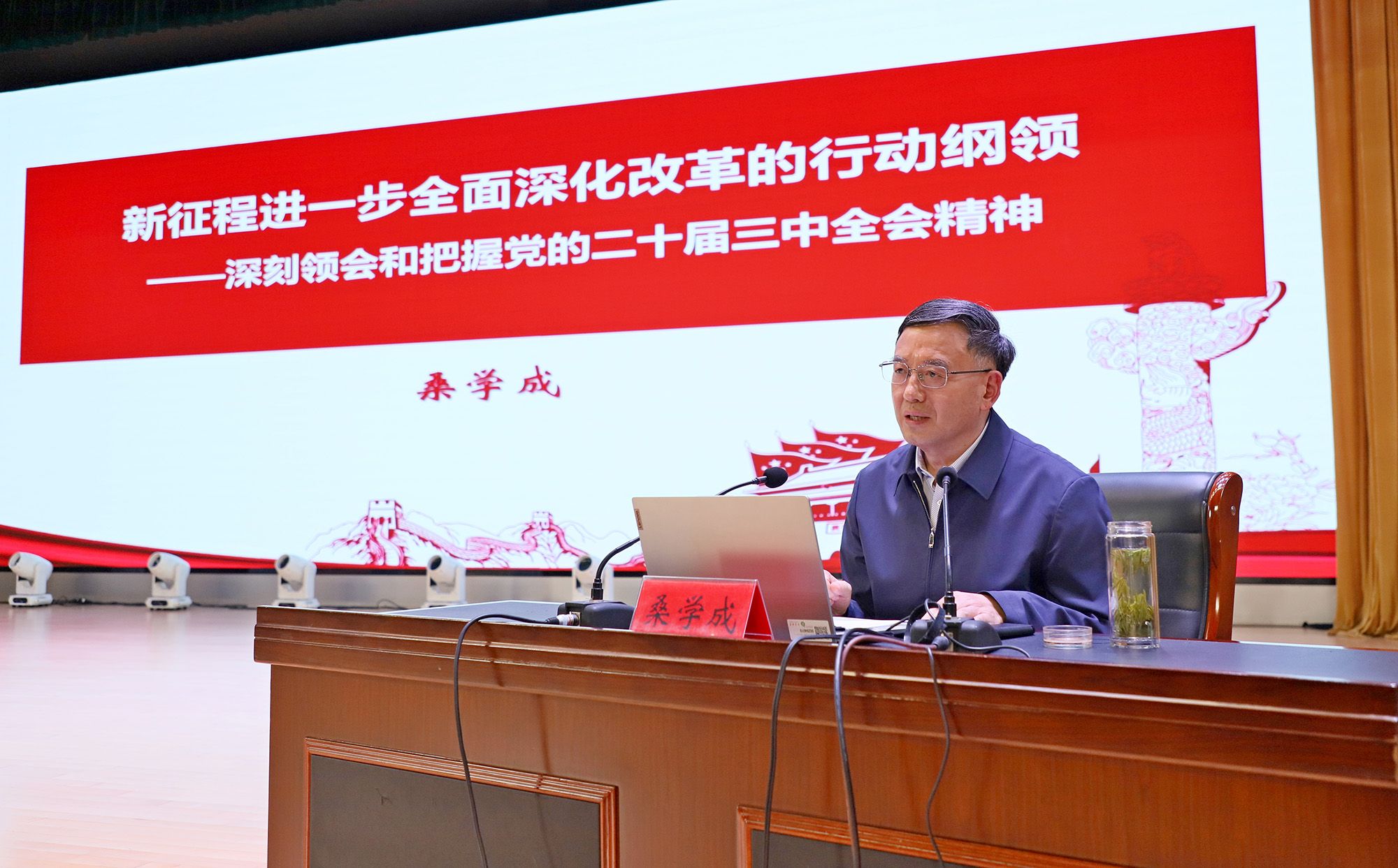 桑学成紧扣党的二十届三中全会精神,围绕习近平总书记在党的二十届三中全会上的重要讲话和全会审议通过的《中共中央关于进一步全面深化改革、推进中国式现代化的决定》,结合习近平总书记在中央党校(国家行政学院)省部级主要领导干部学习贯彻党的二十届三中全会精神专题研讨班开班式上的重要讲话,从深刻领会和把握全会的重大意义和主题,进一步全面深化改革的指导思想、总目标、重大原则、重大举措和根本保证,以及如何抓好全会精神和改革任务的贯彻落实等方面进行了系统解读和深入阐释。