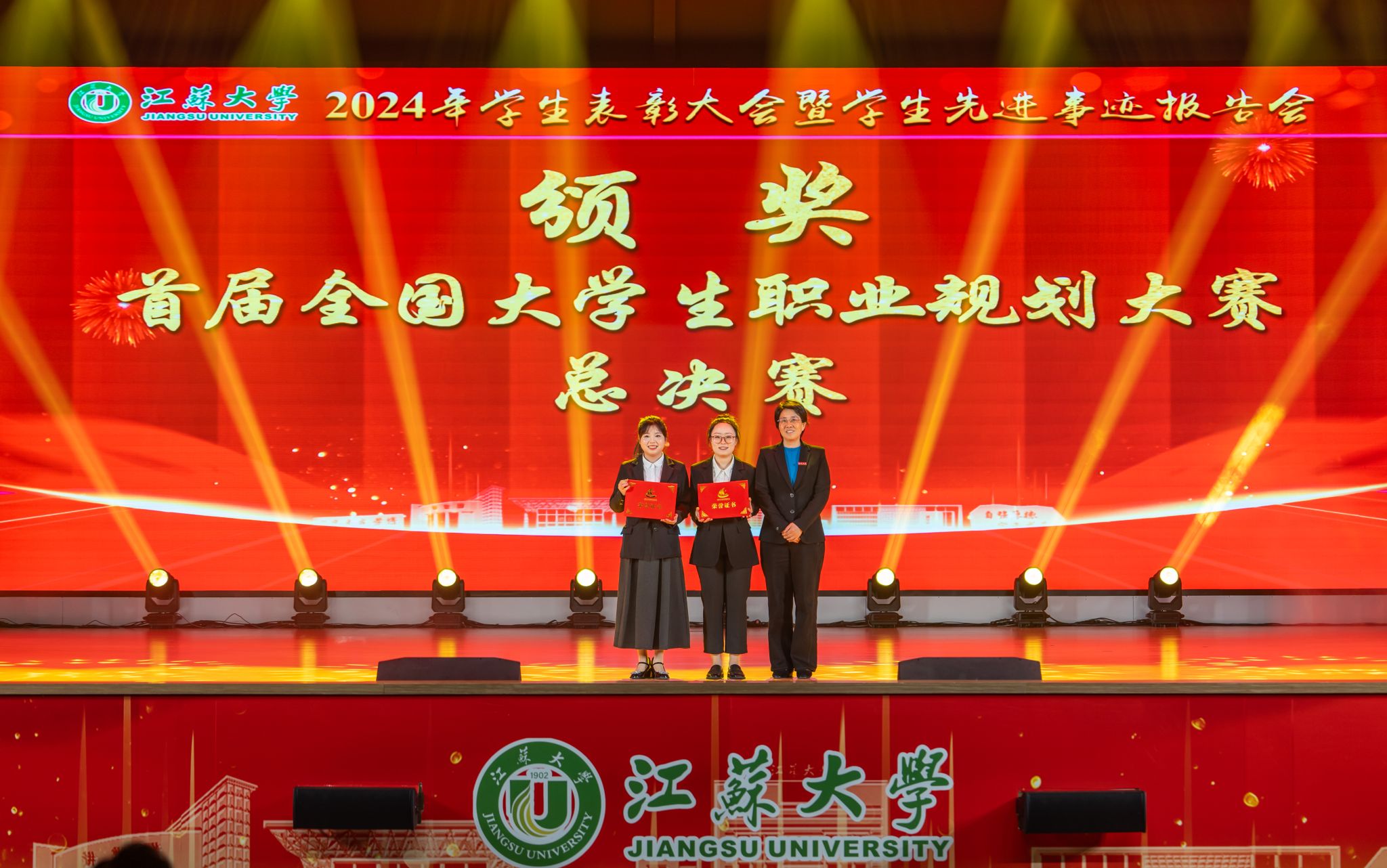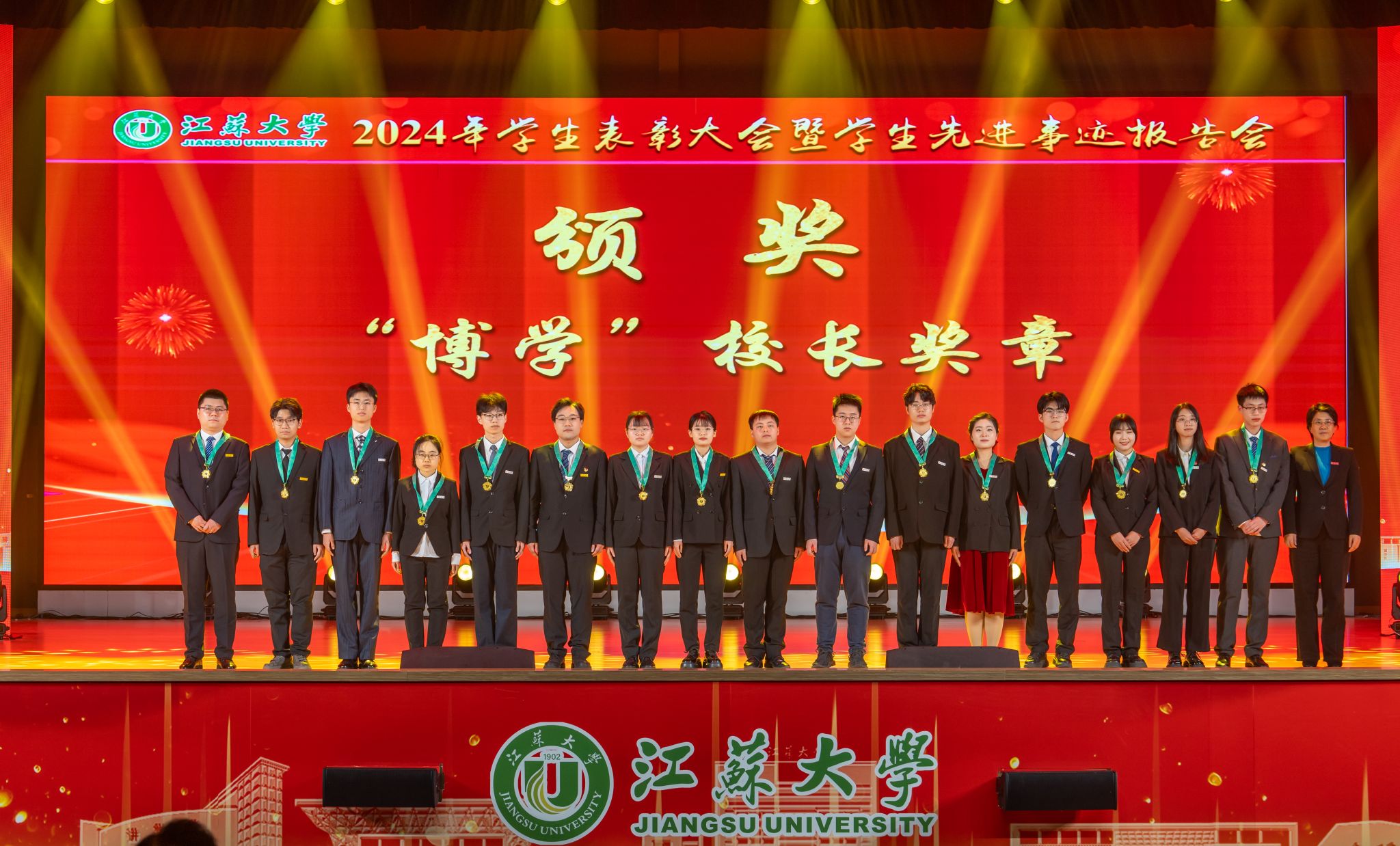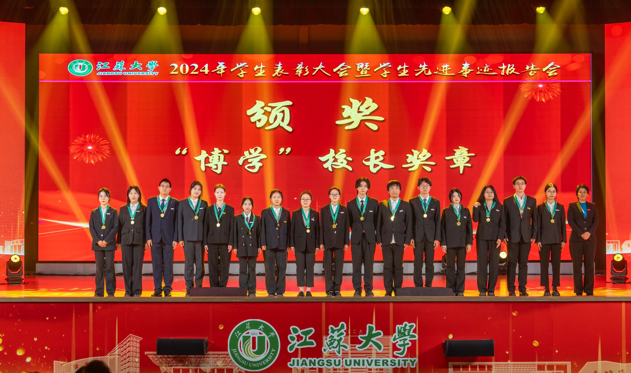 首届全国大学生职业规划大赛金奖获得者、医学院张乐怡,“博学”校长奖章获得者、农工学院研究生姬魁洲,“博学”校长奖章获得者、环安学院本科生赵晗,江苏省先进班集体获奖代表、计算机2101本科生杨宇轩,2024年校社会实践活动十佳个人代表、马克思主义学院研究生吴念真分别分享了自己的青春故事。