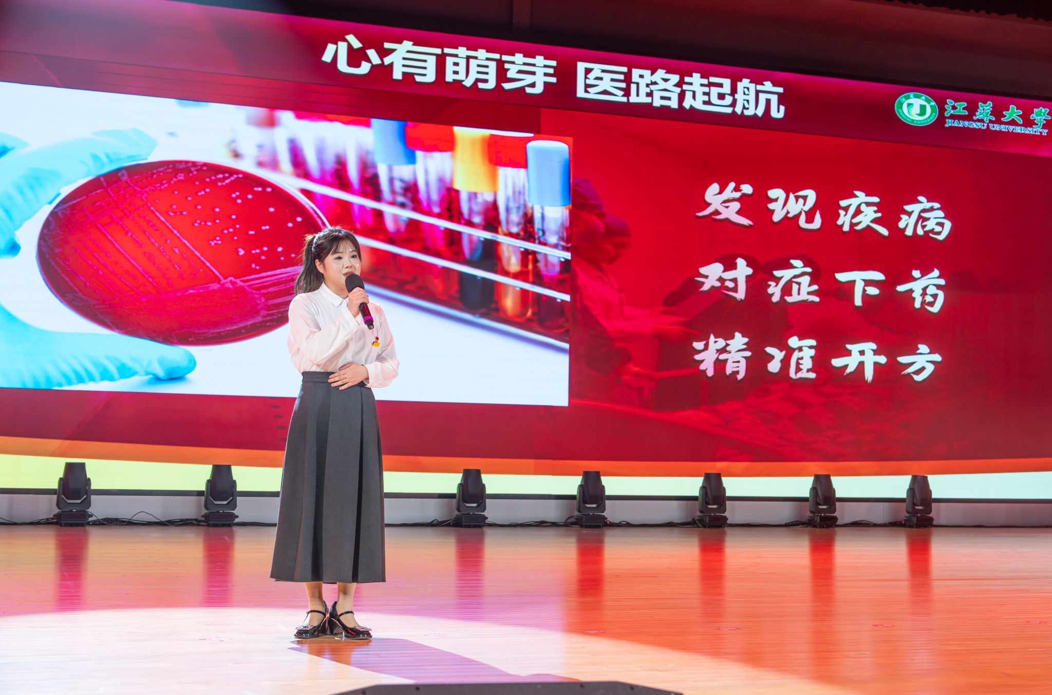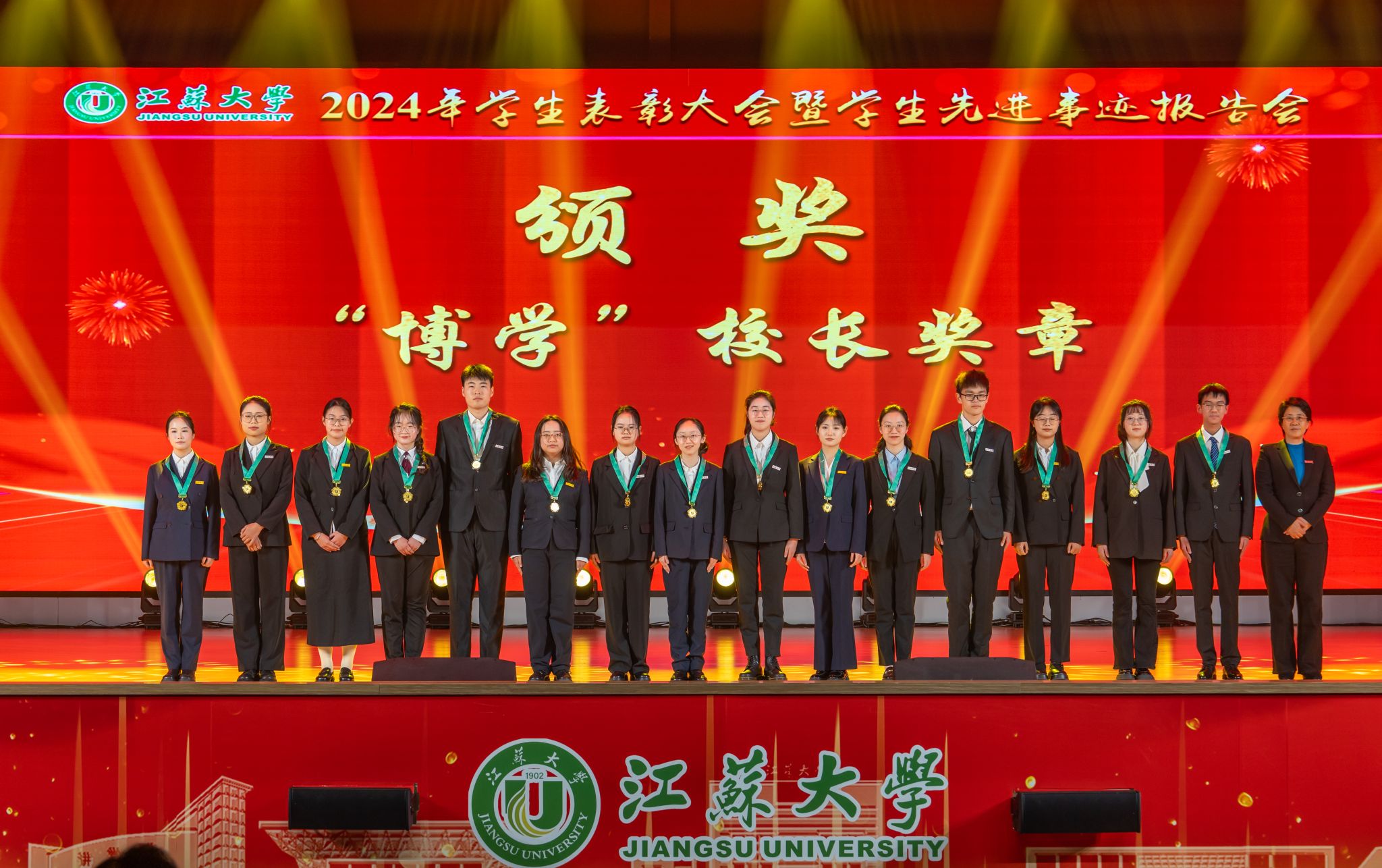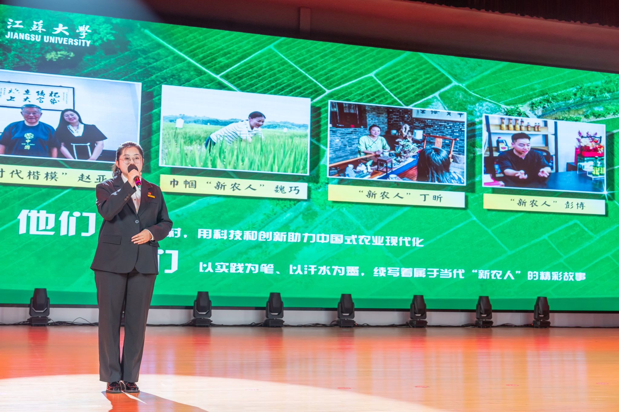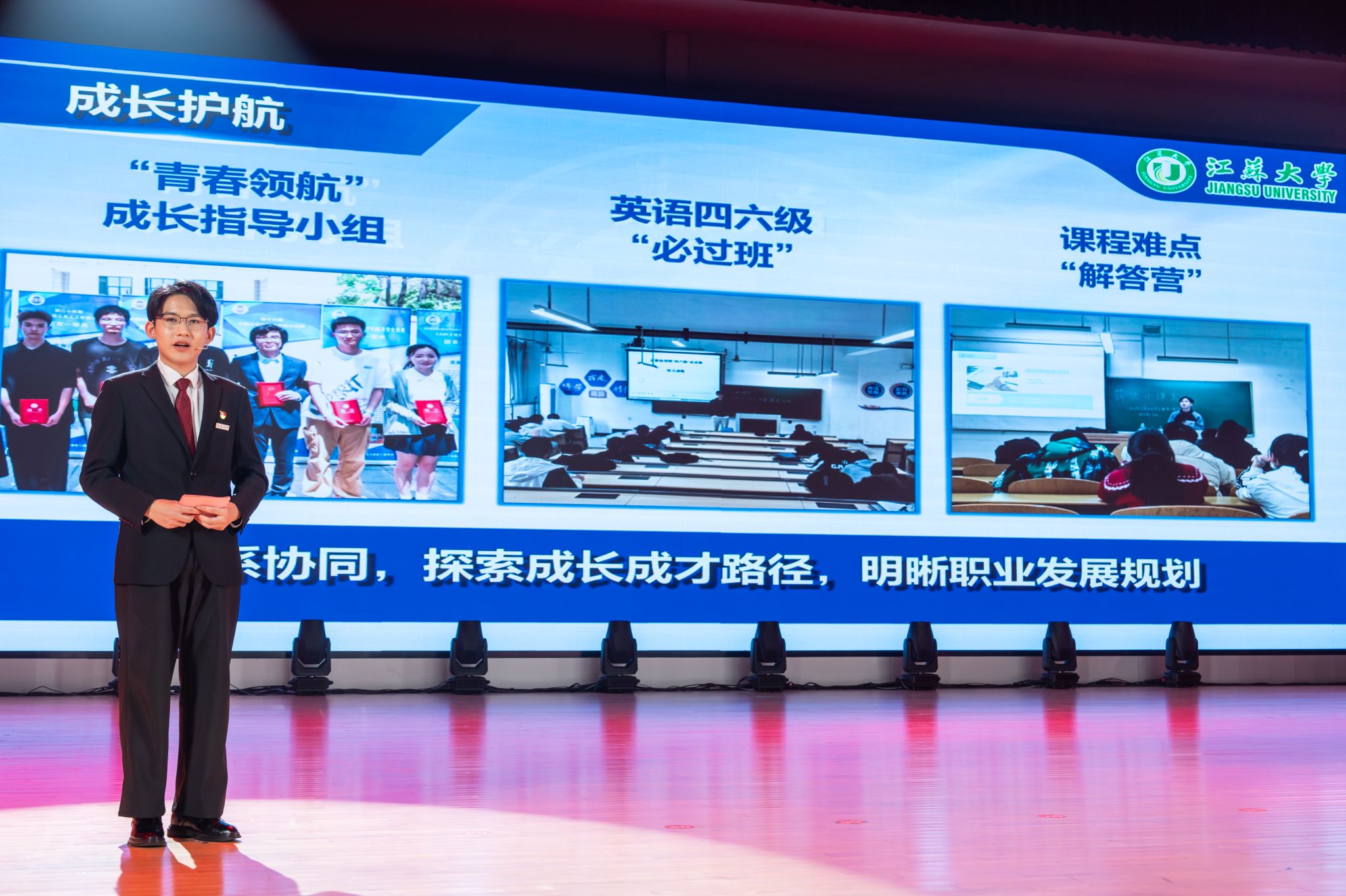 首届全国大学生职业规划大赛金奖获得者、医学院张乐怡,“博学”校长奖章获得者、农工学院研究生姬魁洲,“博学”校长奖章获得者、环安学院本科生赵晗,江苏省先进班集体获奖代表、计算机2101本科生杨宇轩,2024年校社会实践活动十佳个人代表、马克思主义学院研究生吴念真分别分享了自己的青春故事。