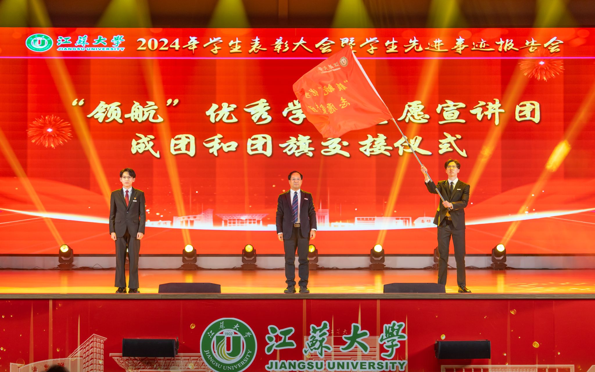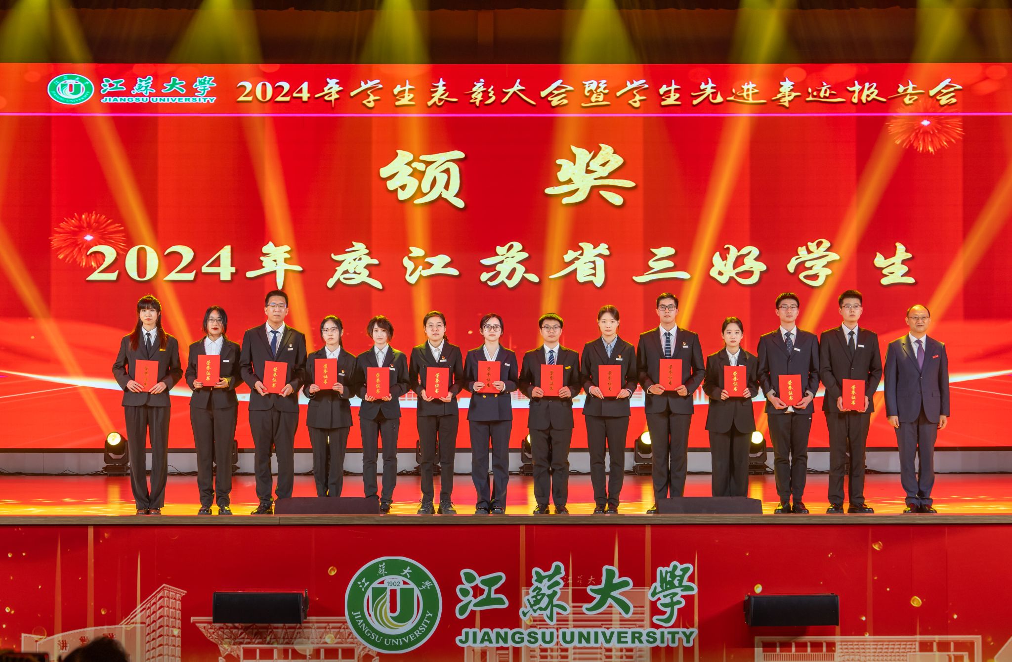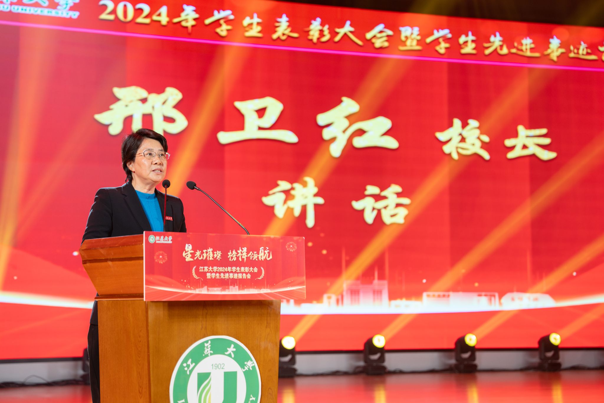 邢卫红向受到表彰的先进集体和优秀个人表示祝贺,向辛勤耕耘在教育教学、管理服务一线的广大教师、辅导员、学业导师及管理服务人员致以崇高敬意和衷心感谢。邢卫红说,学校牢固树立“师生是立校之本”理念,以落实立德树人根本任务为指引,在培养拔尖创新人才上深化改革,面向未来优化学科专业结构,放眼世界延揽高端人才,聚焦国家战略打造高水平科研创新平台,聚力高水平赛事加快推进学科竞赛分类管理,让更多青年学子成才出彩。邢卫红说,江大学子自觉践行“博学、求是、明德”校训精神,主动把“自强厚德,实干求真”江大精神融入日常实践,是有远大理想抱负的青年,是追求卓越、大有作为的青年。邢卫红表示,本次表彰大会既是学生积极进取、奋发向上精神风貌的集中展示,也是激励每一位江大学子奋进新起点、逐梦新征程的鼓劲动员会。她希望同学们致敬榜样、对标榜样、成为榜样,成就更好的自己。