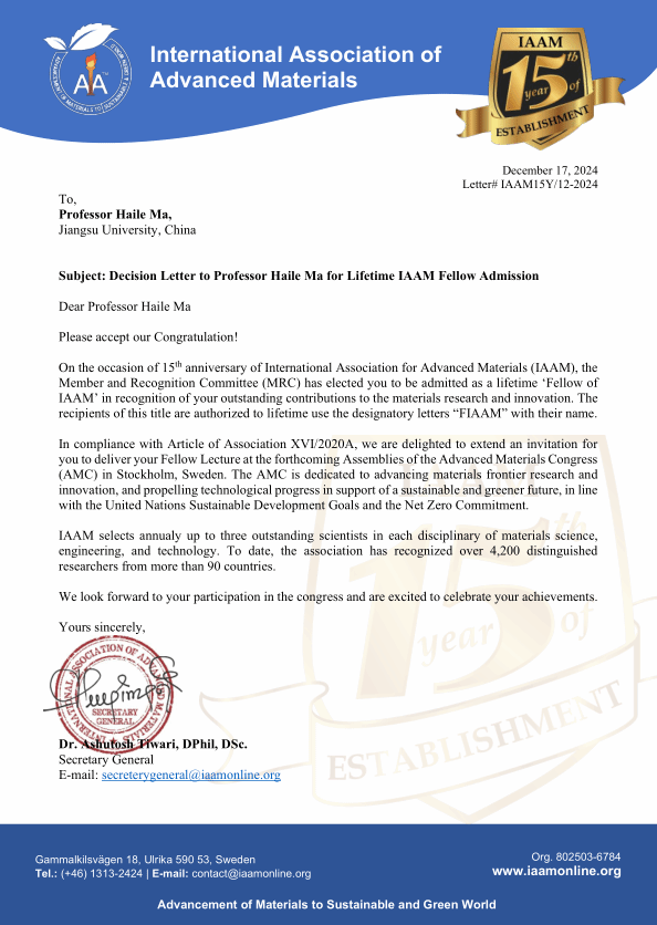 12月19日,我校食品与生物工程学院教授马海乐收到国际先进材料学会(IAAM)秘书长发来的任命函,正式授予其“会士”称号,在庆祝IAAM成立15周年之际表彰其在材料研究和创新方面的杰出贡献。