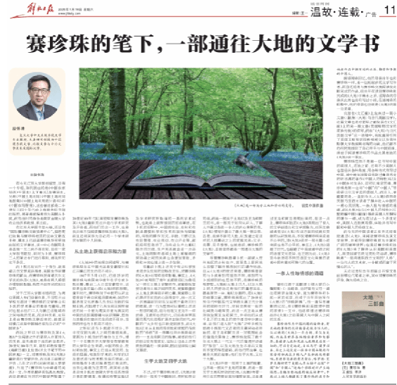 刊文指出,赛珍珠《大地》的地理空间描写与赛珍珠在中国的生活密切相关,尤其是赛珍珠在安徽宿州和江苏镇江的经历。赛珍珠的丈夫卜凯作为农学专家,对中国农业、农村和农民有深入研究,其学术成果对赛珍珠的创作有一定影响。《大地》并非单纯关于中国农民、农村和农业的书,而是关于土地、人性以及家庭关系的书,展现了自然、古老、连绵不断的人性。