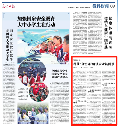 光明日报9版、中国教育报4版、江苏教育报2版以“科技‘金钥匙’解锁农业‘新图景’”为主题,报道了学校积极谋划发展农业新质生产力的要素集聚,加快农业关键核心技术攻关和成果转化,有组织推进人才培养、科技创新和社会服务的生动实践。