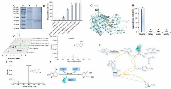 该研究联合RNA-seq及分子对接技术分析了Meyerozyma guilliermondii降解PAT的分子机制,发现M. guilliermondii通过增强抗氧化胁迫、GSH代谢、DNA损伤修复、DNA复制、生长和繁殖、抗性和耐药、潜在降解酶的解毒以及锌指转录因子的调控相关基因的表达来解除或降低PAT胁迫造成的有害影响。该研究还筛选到了一个新型PAT降解酶(短链脱氢酶/还原酶(short-chain dehydrogenase/reductase,MgSDR1))。MgSDR1可在2 h内将10 μg/mL初始浓度的PAT转化为无毒的E-ascladiol。进一步研究发现,生物降解过程对新鲜梨汁的品质没有负面影响。此外,结合分子对接及氨基酸定点突变技术分析了催化三联体(Ser174、Tyr188和Lys192)对MgSDR1降解PAT能力的影响,将上述三个氨基酸残基突变为丙氨酸后,突变蛋白几乎不能降解PAT,表明MgSDR1的催化三联体在PAT降解过程中发挥重要作用。
