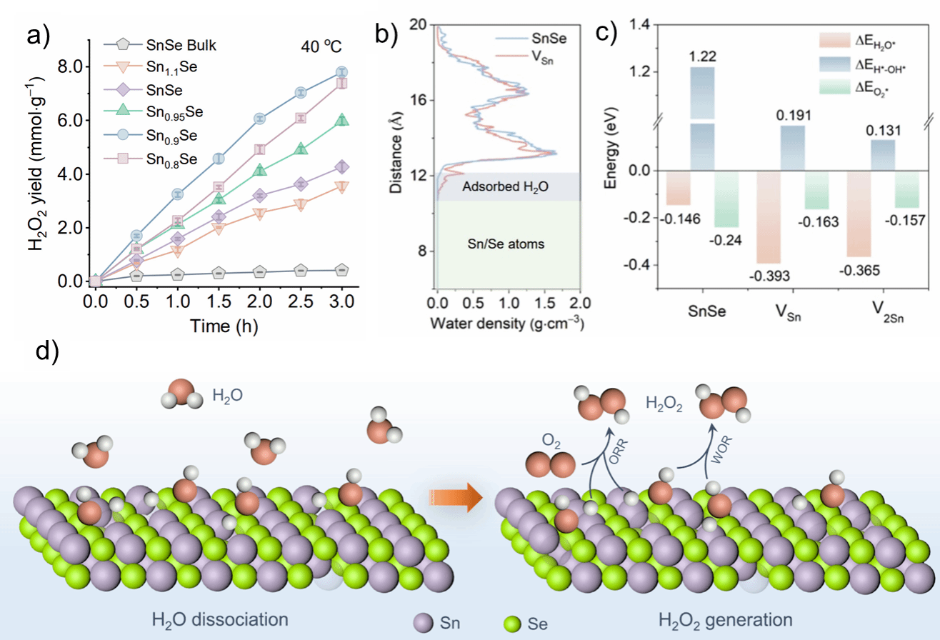 图 a)为富Sn空位的SnSe纳米片在40°C下催化水和氧气合成双氧水性能;图 b)为水分子沿SnSe表面法向的浓度分布的分子动力学模拟;图 c)为SnSe及含Sn空位的SnSe对水的解离能;图 d)为Sn空位缺陷诱导水分子解离及双通道生成双氧水机理示意图。