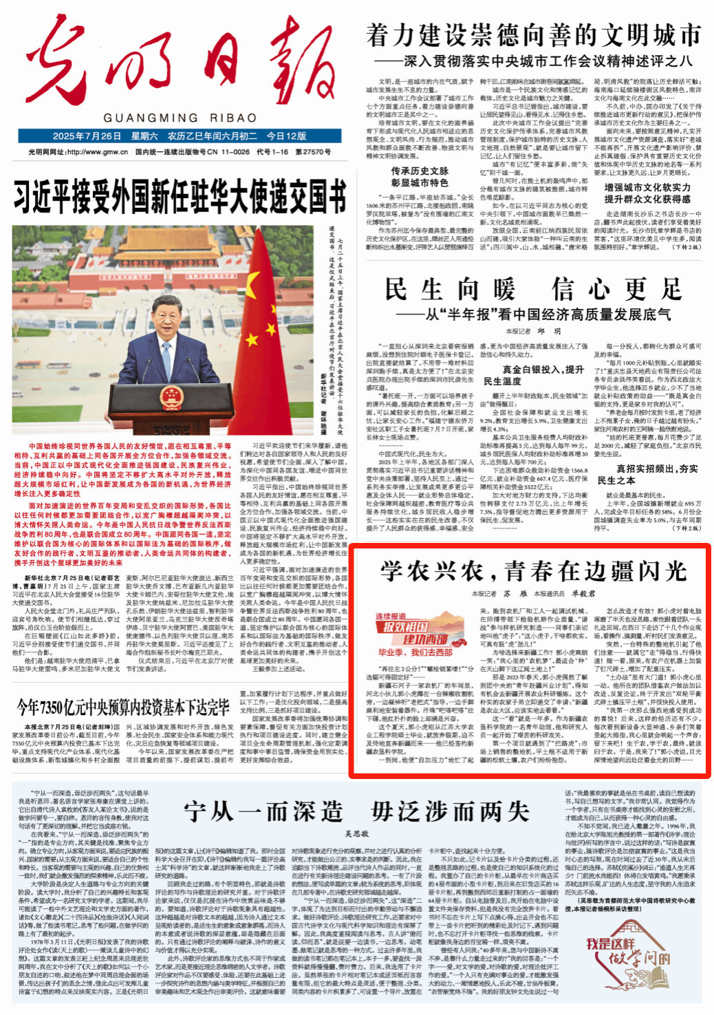 《光明日报》头版刊发《学农兴农,青春在边疆闪光》,报道我校农业工程学院2025届硕士毕业生郭小虎投身新疆农业科研的事迹,生动展现了我校学子服务国家战略、将所学知识奉献边疆的责任担当。