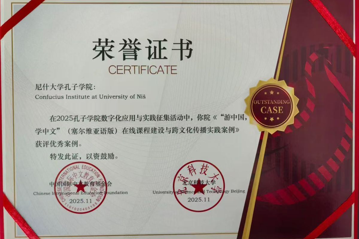 在同期举办的2025孔子学院数字化应用与实践案例征集活动中,外派至孔院的文学院教师罗立新负责的《“游中国 学中文”(塞尔维亚语版)在线课程建设与跨文化传播实践案例》,以及我校国际中文教育专业毕业生、教师杨念提交的《从镜头中走来——短视频赋能国际中文教育的创新实践》,获评优秀案例,展现了孔院在数字化教学与跨文化传播方面的前沿探索与扎实成效。
