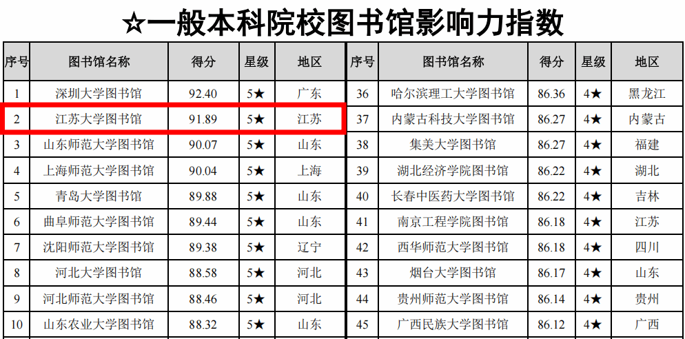 近日,武汉大学中国科学评价研究中心以及数字出版智能服务技术教育部工程研究中心发布《数智时代中国图书馆影响力评价报告(2025)》,报告从基础实力、网站影响力、新媒体影响力、社会影响力、学术影响力5个方面对全国高校图书馆、公共图书馆和专业图书馆进行了评价。我校图书馆获评五星等级,名列中国本科院校图书馆影响力总排行榜第30名,一般本科院校图书馆影响力排行榜第2名,高校图书馆学术影响力排行榜第3名。
