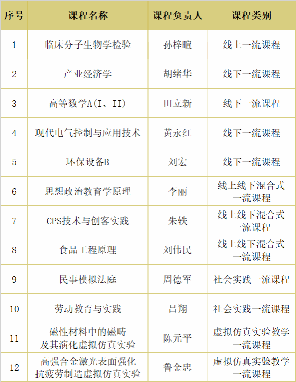 近日,教育部正式公布第三批国家级一流本科课程认定结果,我校12门课程入选,其中线上一流课程1门、线下一流课程4门、线上线下混合式一流课程3门、社会实践一流课程2门、虚拟仿真实验教学一流课程2门。