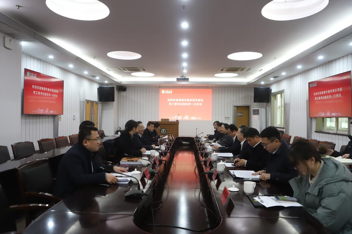 2月9日,南通市通州湾示范区党工委书记陆忠华,沿海开发集团有限公司党委书记、董事长郝三旺率队来校交流,校党委副书记杨道建、副校长郁明华接待了陆忠华一行。