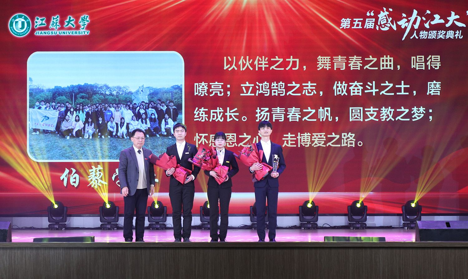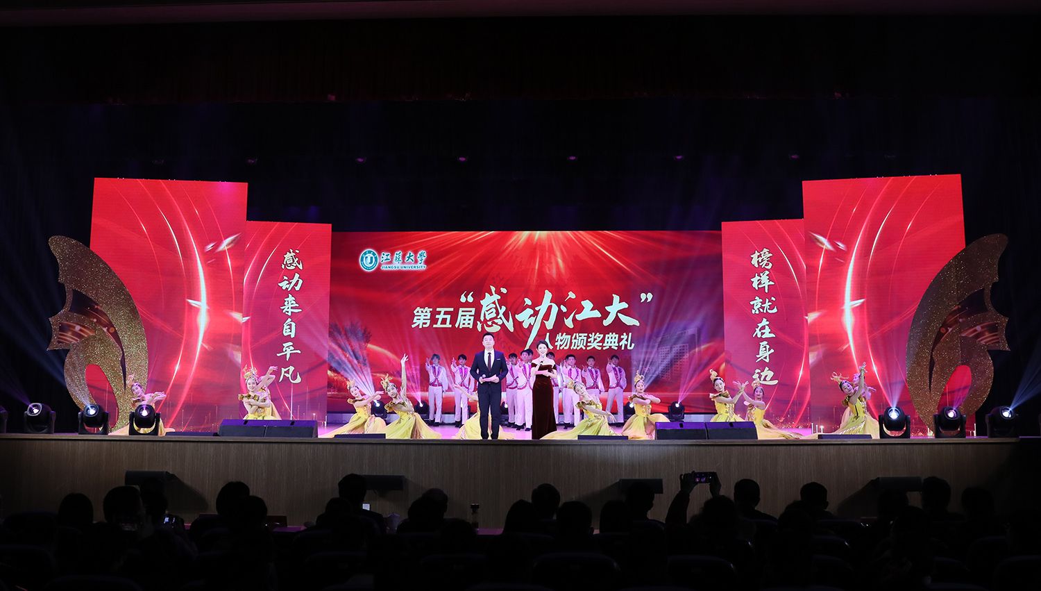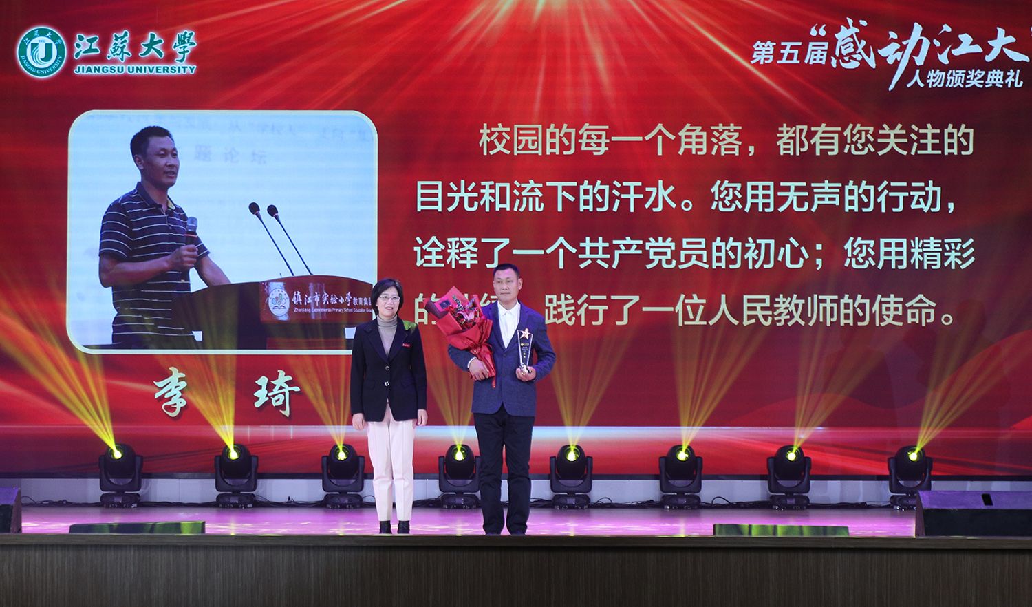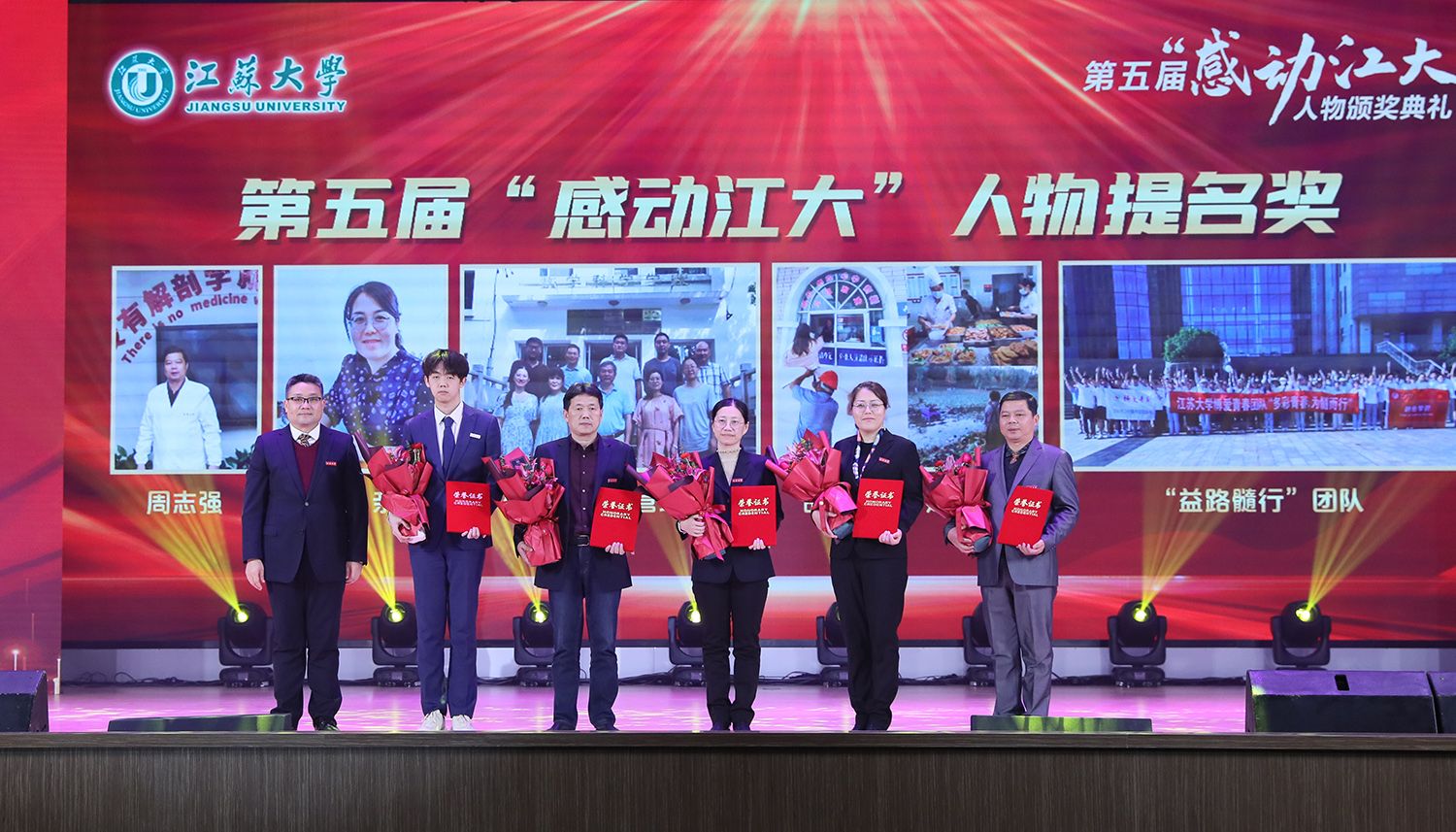典礼现场,与会领导还为荣获第五届“感动江大”人物提名奖的医学院教师周志强、药学院教师马亲、数学科学学院中外合作教学管理团队、后勤管理处品质后勤团队、财经学院“益路髓行”团队颁奖。