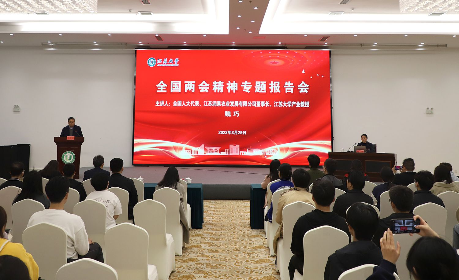3月29日,开云手机·官方站官网全国两会精神专题报告会在青教公寓多功能厅举行。全国人大代表、镇江市镇江新区永兴农机机械化专业合作社理事长、江苏润果农业发展有限公司董事长、开云手机·官方站官网产业教授魏巧走进校园,为师生作全国两会精神专题报告。报告会由校党委常委、宣传部部长杨道建主持。