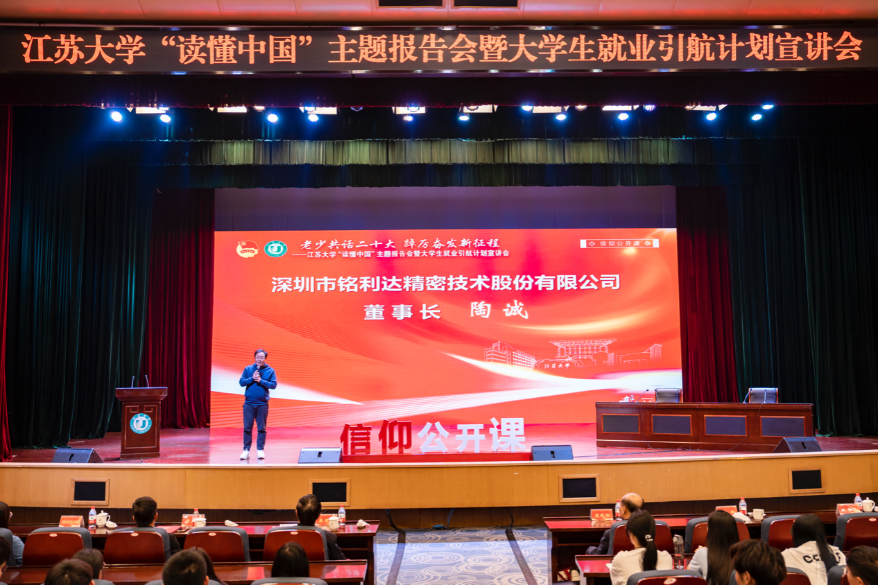 5月8日,“读懂中国”主题报告会暨大学生就业引航计划宣讲会在校本部小礼堂举行。校长颜晓红,校关工委常务副主任柴顺根,学校热加工93级校友、深圳市铭利达精密技术股份有限公司董事长陶诚,机械制造及自动化专业97级校友、深圳市联发科网络技术有限公司董事长兼总经理黄兴华,校友会、团委、计算机学院相关同志及学生代表近千人参加活动。计算机学院院长毛启容主持客座教授聘任仪式,外联办主任任泽中主持主题报告会。
