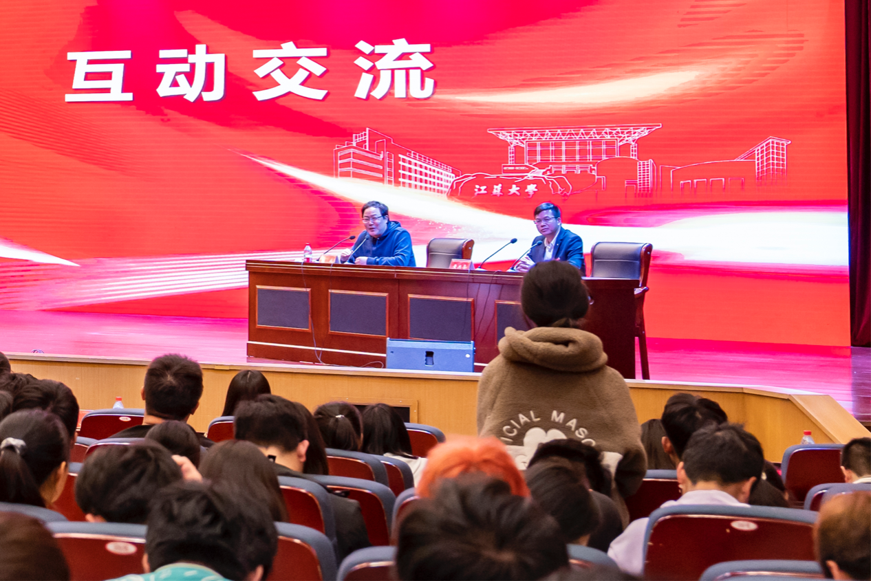 黄兴华结合自身创业历程和心得感悟,号召江大学子积极响应党和国家政策战略,主动到基层“自找苦吃”,脚踏实地,埋头苦干,培养发现问题的敏锐眼光,提升用专业知识解决实际问题的能力素质。