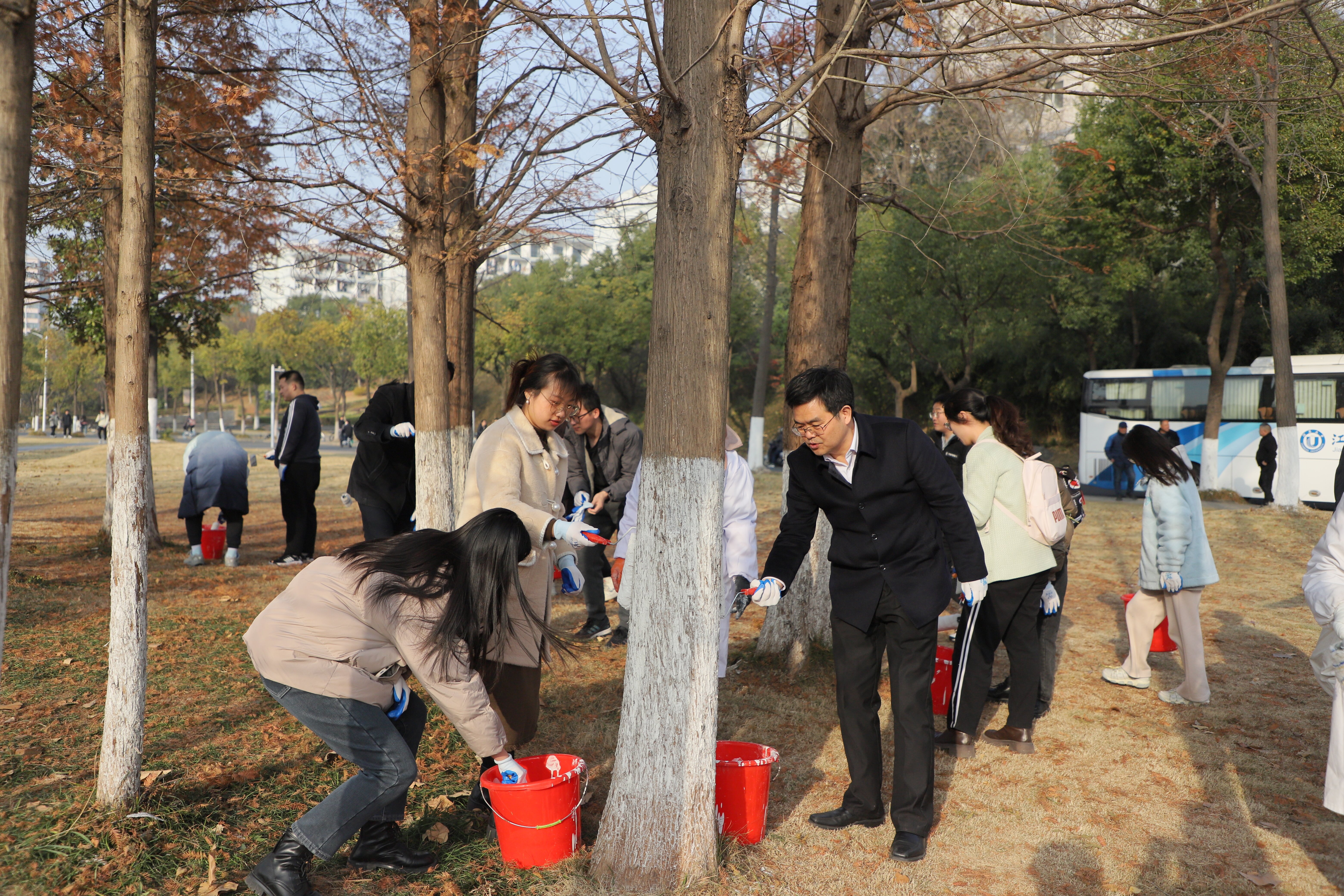 当天下午,李洪波走进求实书院,参加“冬日护绿,树木刷白”劳动实践活动,与书院学生共同为树木刷白,呵护校园一草一木安全越冬。