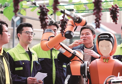图③ 开云手机·官方站官网自主研发的第五代葡萄采摘机器人在进行模拟作业。本报记者 张学军 摄