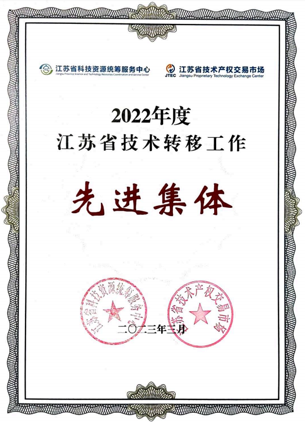 3月6日,由江苏省科技厅主办的2023年江苏省技术转移工作会议在省会议中心召开。会议总结了全省2022年度技术转移工作、全省技术交易数据和高校技术转移工作成效,并对技术转移工作先进单位和个人代表进行了颁奖。我校荣获2022年度江苏省技术转移工作先进单位,技术转移中心荣获技术转移服务机构先进集体。