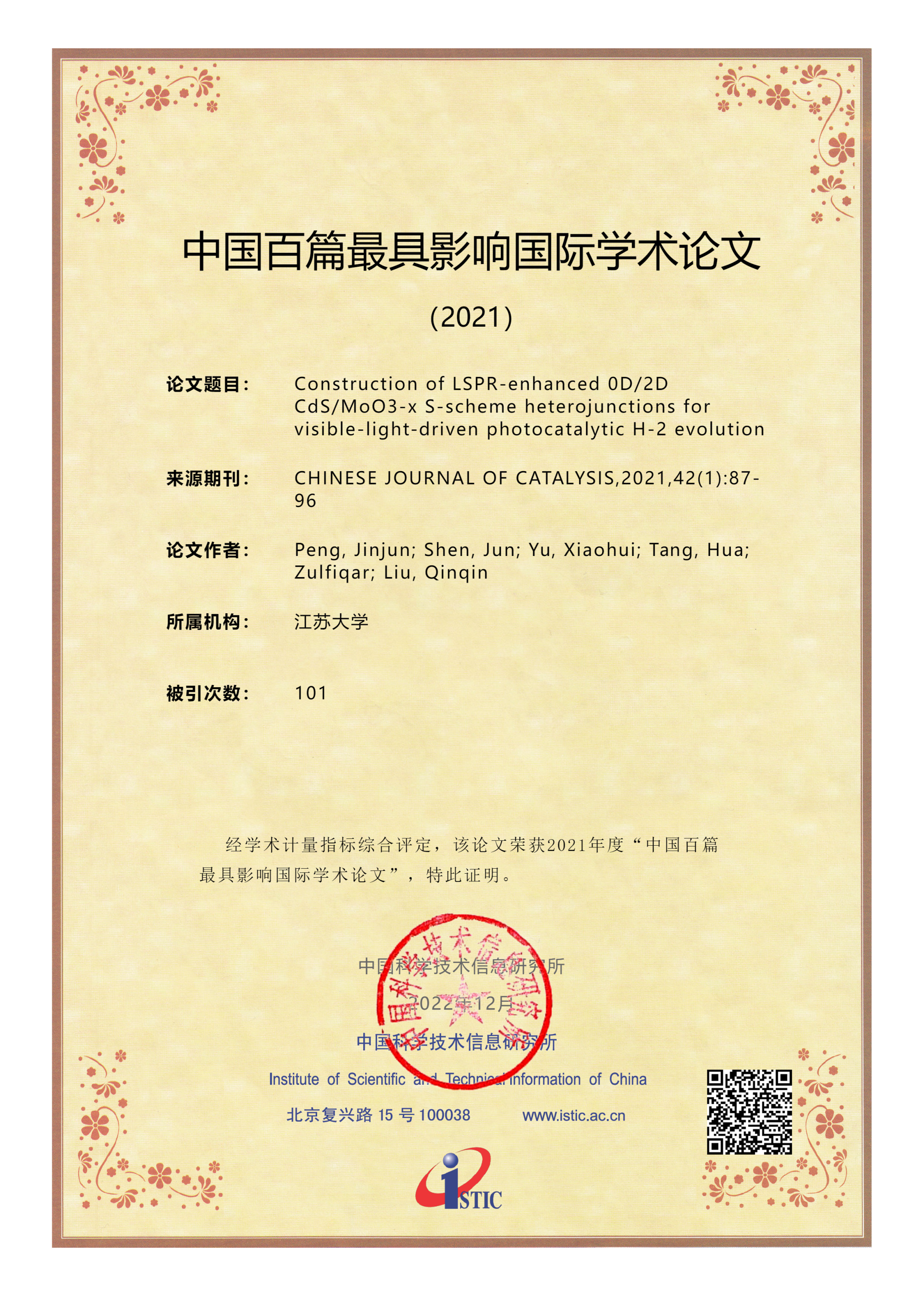 12月29日,中国科学技术信息研究所线上举办本年度“中国科技论文统计报告发布会”,报告公布了本年度中国百篇最具影响国际(国内)学术论文。我校材料科学与工程学院刘芹芹教授发表在Chinese Journal of Catalysis的2021年第42卷第1期的论文Construction of LSPR-enhanced 0D/2D CdS/MoO3−x S-scheme heterojunctions for visible-light-driven photocatalytic H2 evolution入选2021年中国百篇最具影响国内学术论文。