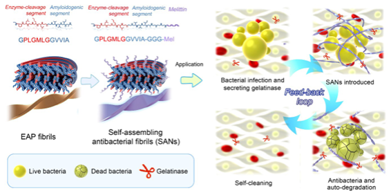 刘磊团队受生物体内维持蛋白质稳态的质量控制系统启发,利用一些细菌可分泌明胶酶的特性,提出了一种具有智能可控降解的肽基纳米材料设计策略,成功构建了受细菌分泌酶反馈降解的抗菌肽纤维。作者验证了纤维快速杀菌与被酶缓慢降解的规律,确保高效杀菌和纤维清除的效率。该工作为功能性多肽纤维的智能设计提供了一种新的策略,该反馈调节策略可优化所设计的纤维材料的生物相容性和生物安全性,为进一步开发智能生物材料和开展相关生物医学应用提供启示。
