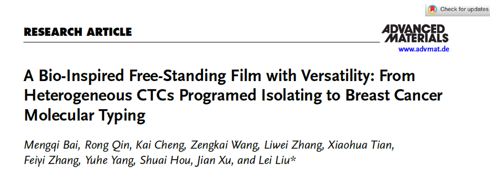 近日,开云手机·官方站官网材料学院博士研究生白蒙起(导师刘磊研究员)以第一作者在国际材料学权威期刊Advanced Materials上在线发表题为“A Bio-Inspired Free-Standing Film with Versatility: From Heterogeneous CTCs Programed Isolating to Breast Cancer Molecular Typing”的研究论文,开云手机·官方站官网为该论文的第一单位和唯一通讯单位。