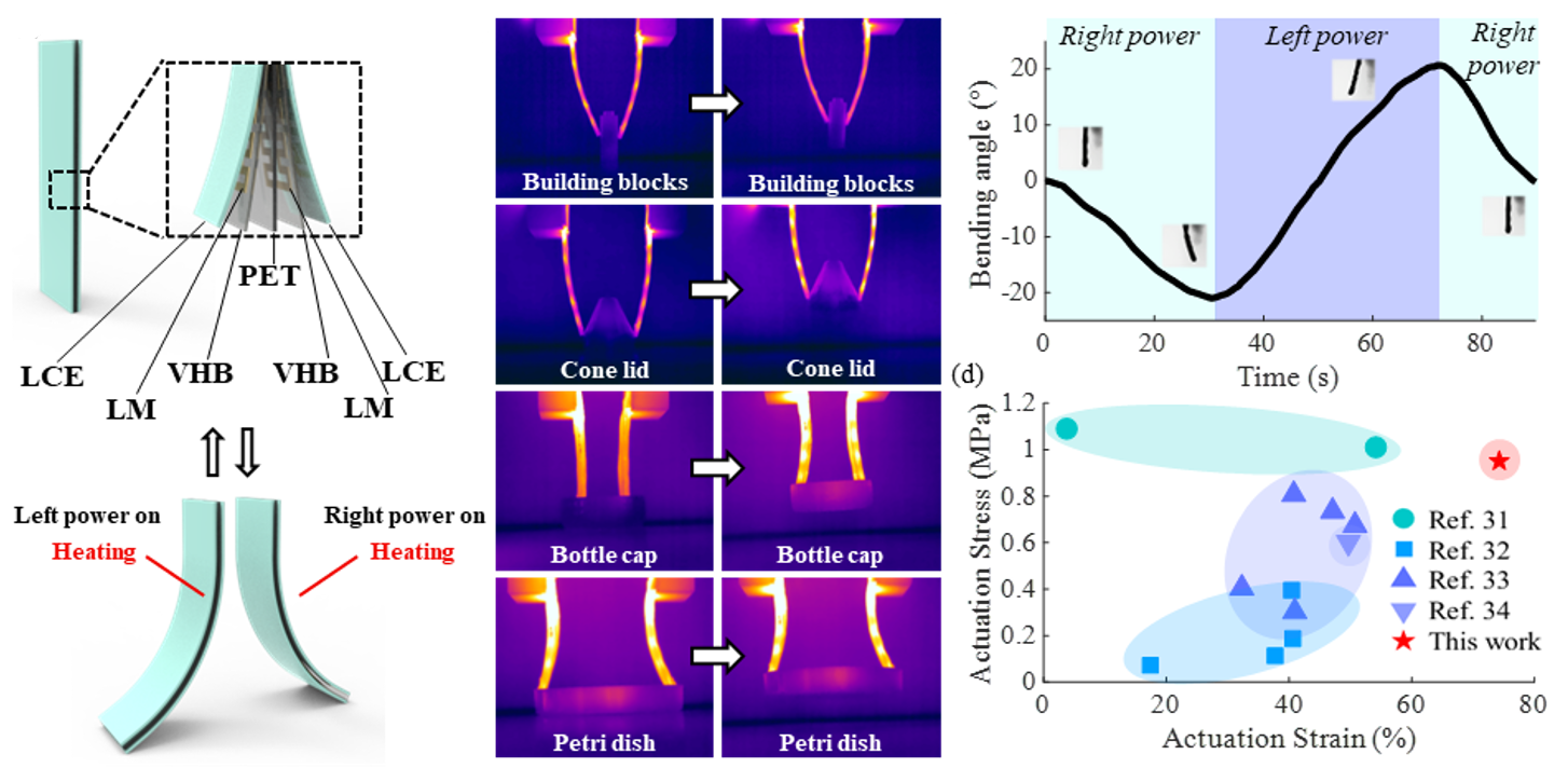 研究还阐述了基于LCE-LM电驱动器的一些其他有趣的应用。如图3所示,研究人员构建了手掌可动(5 mm~ 55 mm)的双向驱控的柔性夹持器,在 2 A 至 4 A 的低电流刺激下,可以精确外夹或内撑抓取如文件夹、螺钉、烧杯和环形工件等异形物品,解决了传统外夹式单向驱动的液晶弹性体柔性夹持器受其驱动结构的制约,难以精确抓取异形环形等工件,应用潜力受到限制的问题。值得注意的是,夹持器可保留97%水重量下夹持吸水海绵,在柔性异形敏感物品的抓取中展现出优势。