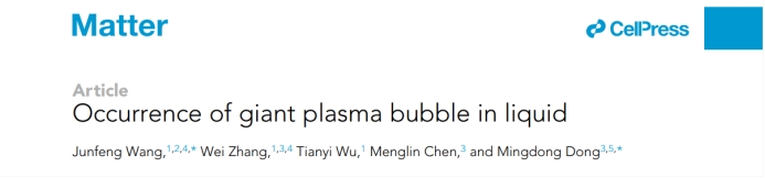 我校能源与动力工程学院王军锋教授团队与丹麦奥胡斯大学跨学科纳米科学中心董明东教授团队合作,在Cell出版社国际顶刊《物质》(Matter)上发表了题为“Occurrence of giant plasma bubble in liquid”的最新研究成果,并被推荐为期刊封面论文。王军锋是第一作者兼通讯作者,董明东是共同通讯作者,张伟博士后是共同第一作者。